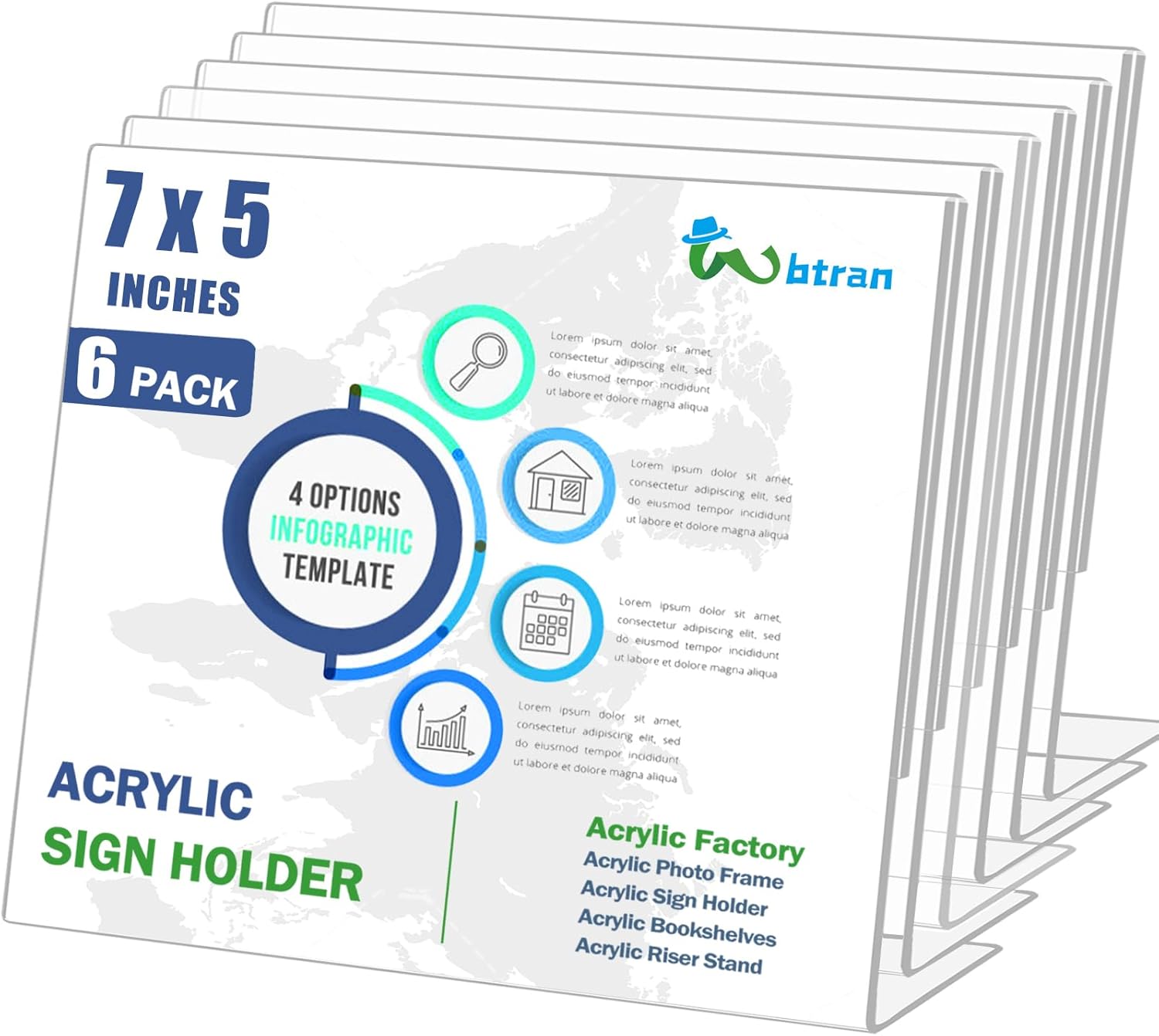 Slanted Back Acrylic Sign Holder 5 x 7 Horizontal, Clear Tabletop Acrylic Stands for Display 7 x 5, Plastic Paper Sign Holder for Office, Home, Restaurant (6 Pack 7x5 Inches)