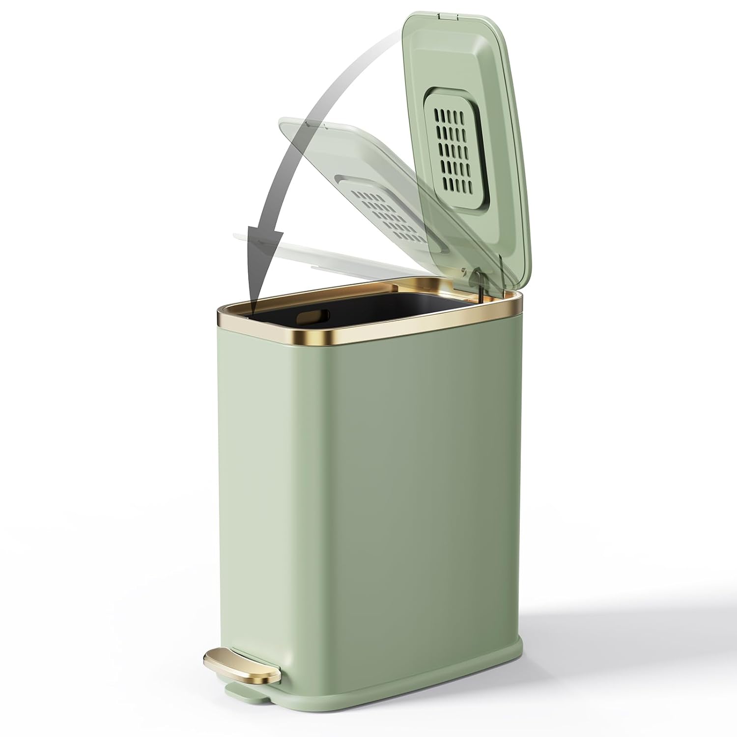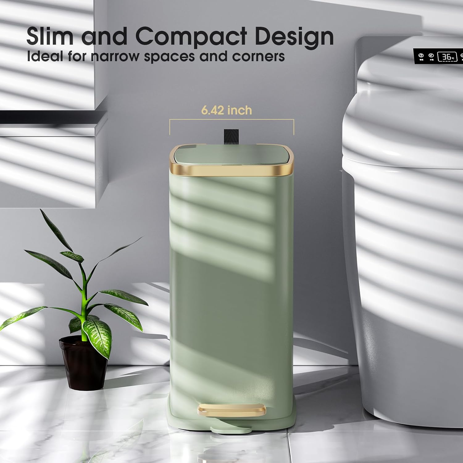 CEROELDA Small Bathroom Trash Can with Lid Soft Close-5L/1.3 Gal Slim Garbage Can-Metal Step Wastebasket-Rectangle Narrow Waste Bin for Office, Bedroom, Toilet, Live Room-Green