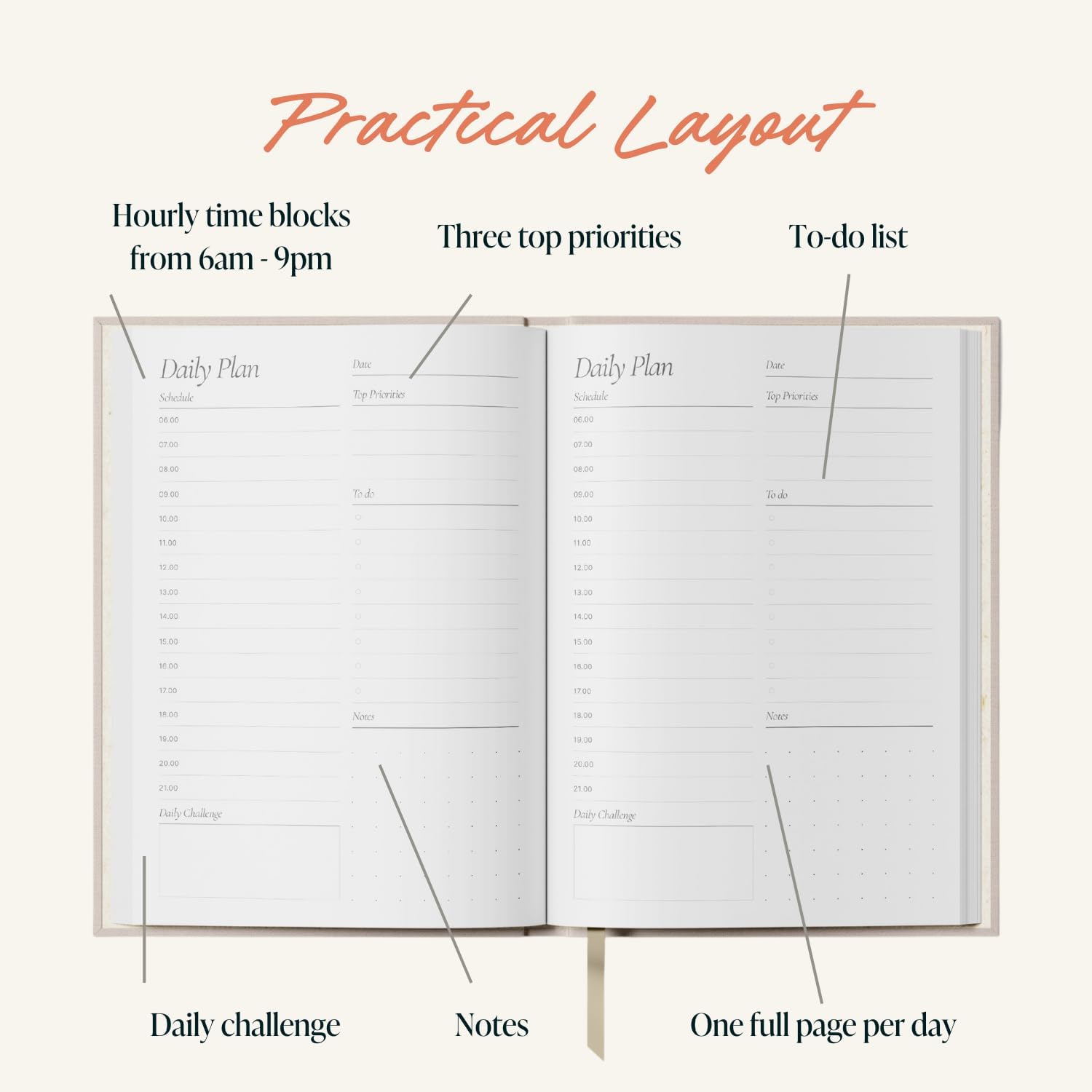 - Comprehensive daily schedule from 6 AM to 9 PM. Also includes weekly planner pages.