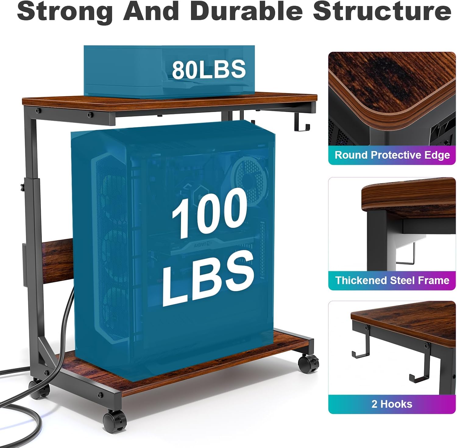 - Pc Tower Stand With Charging Station: This Mobile PC Standing with dual 120V/12A outlets and dual USB ports can power your laptop, smartphone, printer, tablet or any electronic device. Great for keeping an organized workspace. Plus, the PC Tower Rack doubles as a side table to provide additional power for your desk lamp
