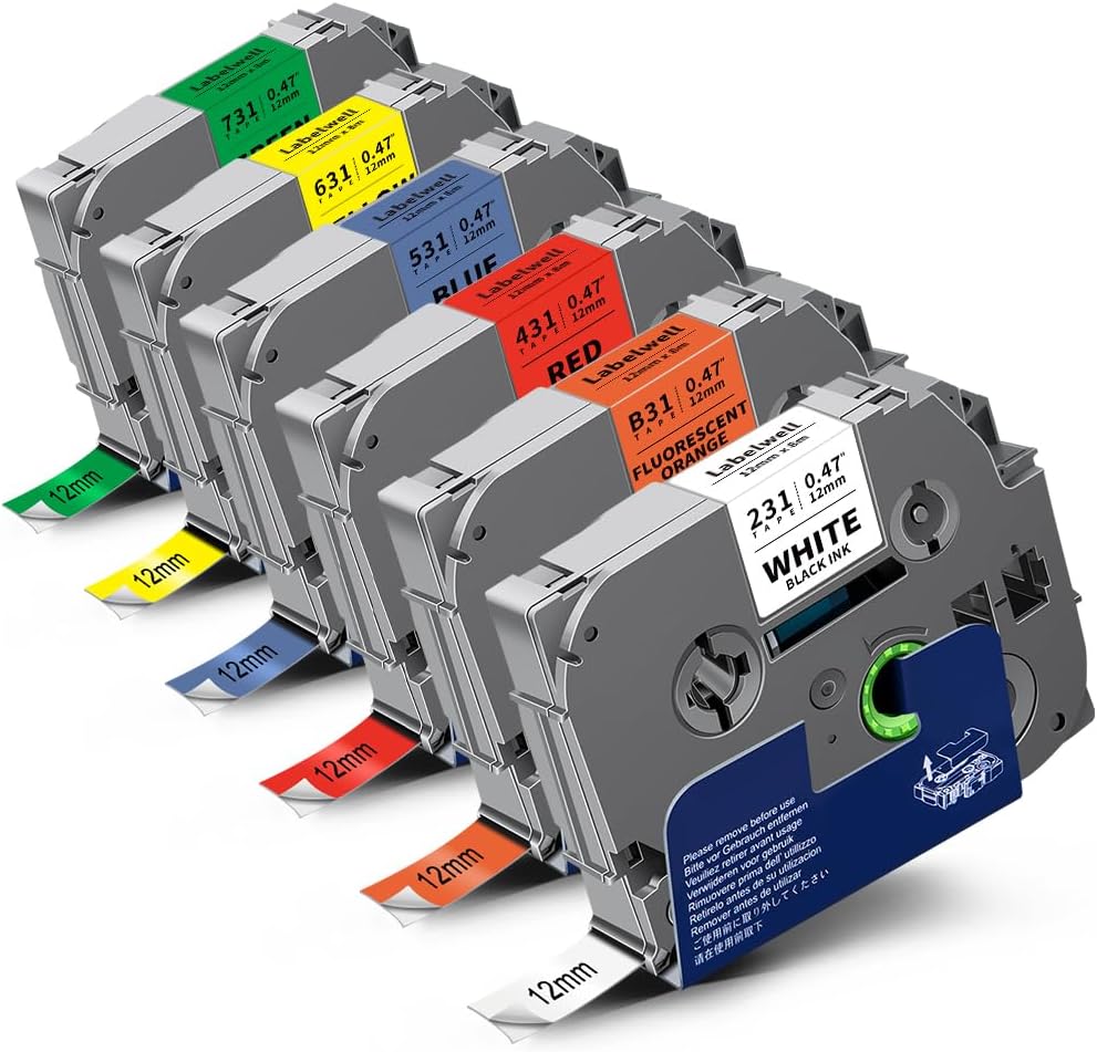 - Package Contents: 6-Pack Replacement for Brother P Touch Label Tape 12mm 0.47 Inch TZe-B31 (Black on Flu.Orange), TZe-131(Black on Clear), TZe-231(Black on White), TZe-431 (Black on Red), TZe-531 (Black on Blue), TZe-631 (Black on Yellow) Compatible with Brother P Touch Label Makers