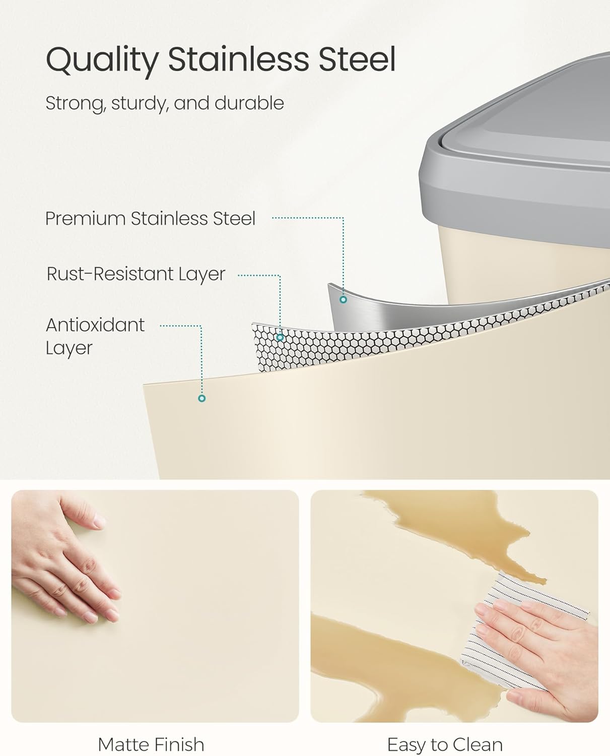 - [Quality Stainless Steel] Made from stainless steel, this trash can is rust-resistant and easy to clean. It adds a stylish modern touch to any kitchen