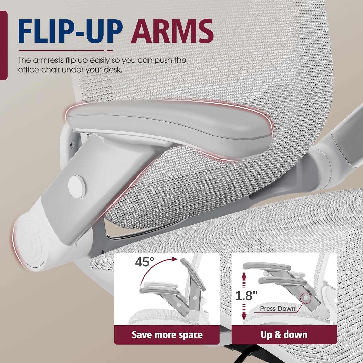 - 【ADJUSTABLE FLIP-UP ARMS】-If you want to make the most of the space under the table or choose a home desk chair for a small space/bedroom, this is the office chair for you! The GABRYLLY ergonomic office mesh chairs' armrest can be folded up(45°) and be adjusted the arms' height(1.8'').