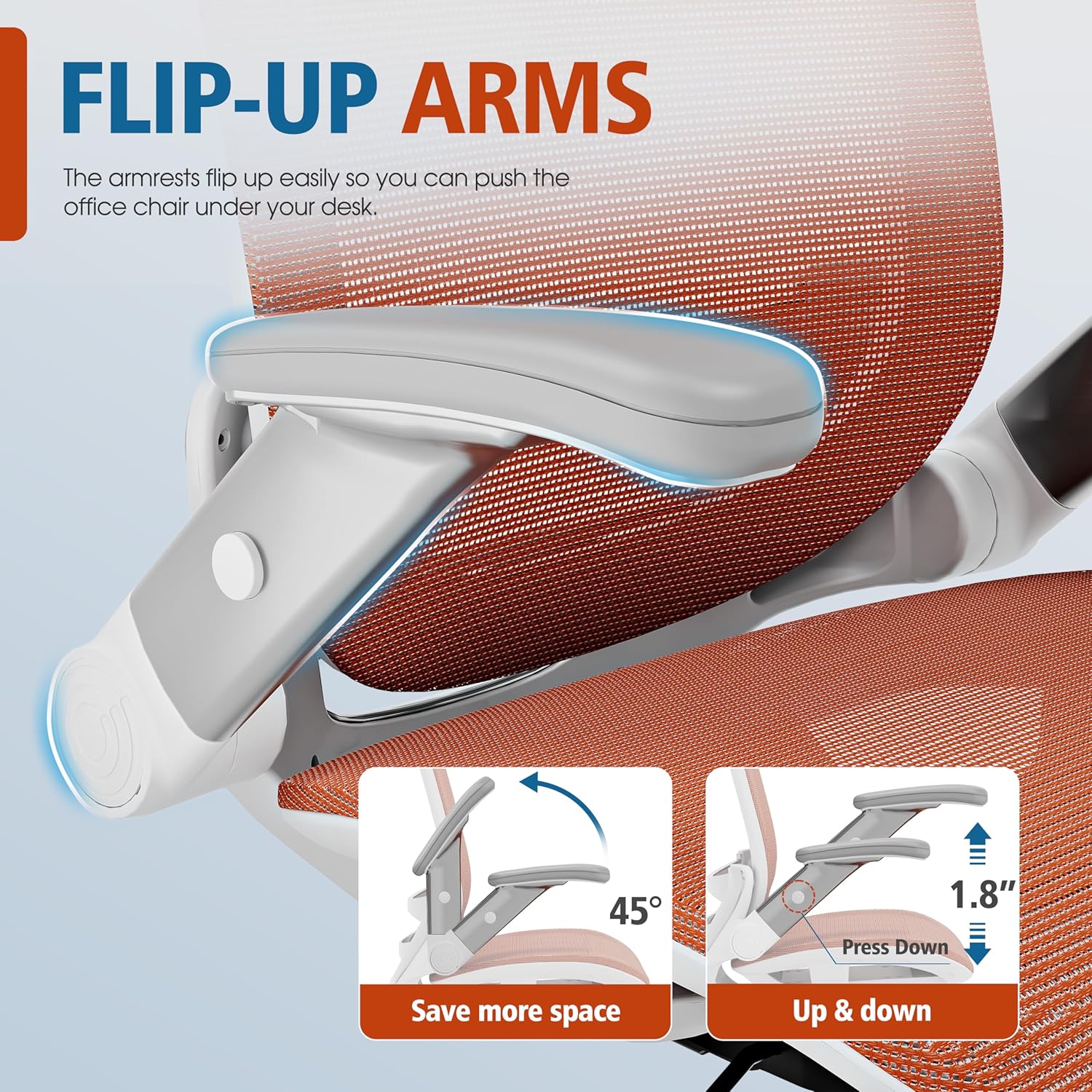 GABRYLLY Ergonomic Office Chair, High Back Home Desk Chair with Headrest, Flip-Up Arms, 90-120° Tilt Lock and Wide Cushion, 400LBS Mesh Chairs for Man Woman, White Task Chair(Orange,GY01WOR)