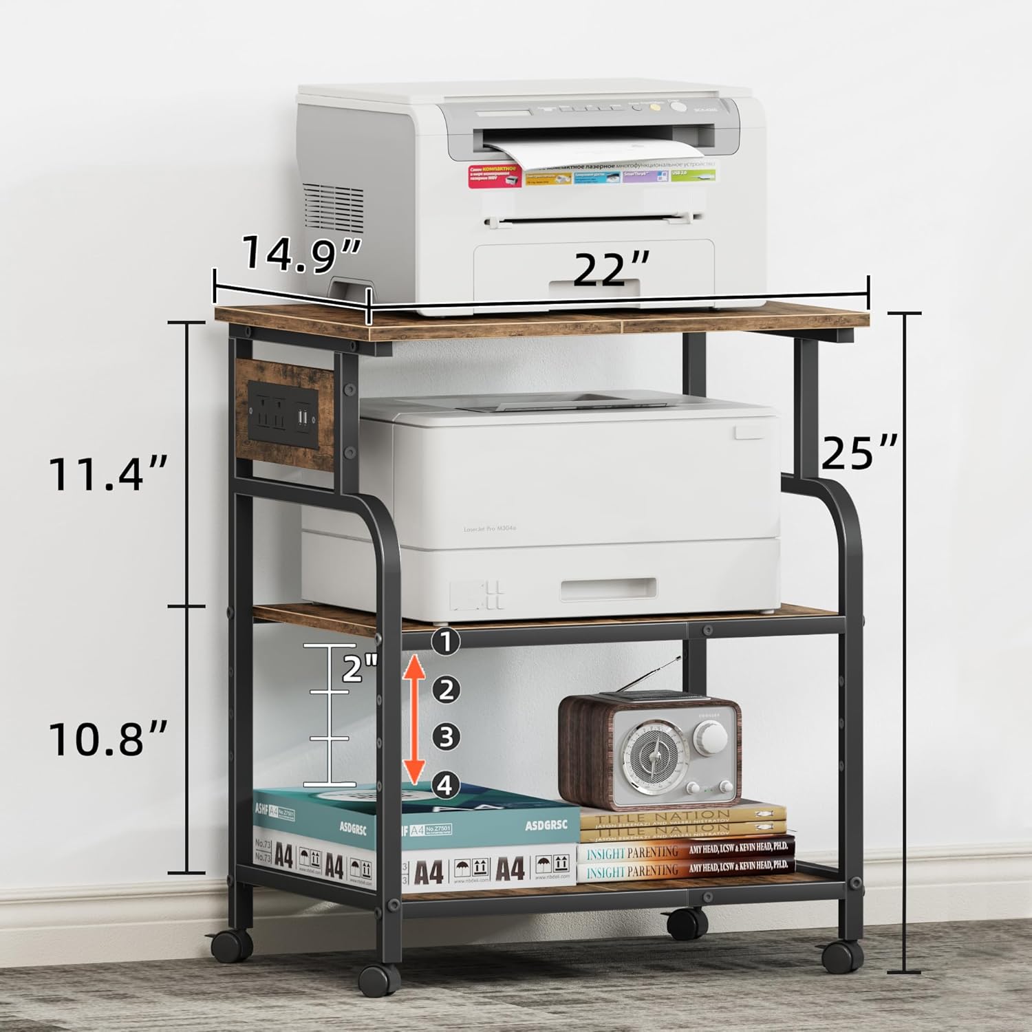 - 【Height Adjustable Storage Shelf】Printer stand is 4-Level height adjustable(2" each level), you can set the middle shelf in different height position according to your demand. 3-Tier Printer stand with storage offer ample space for your printer/CPU/office supplies/paper/plants etc.