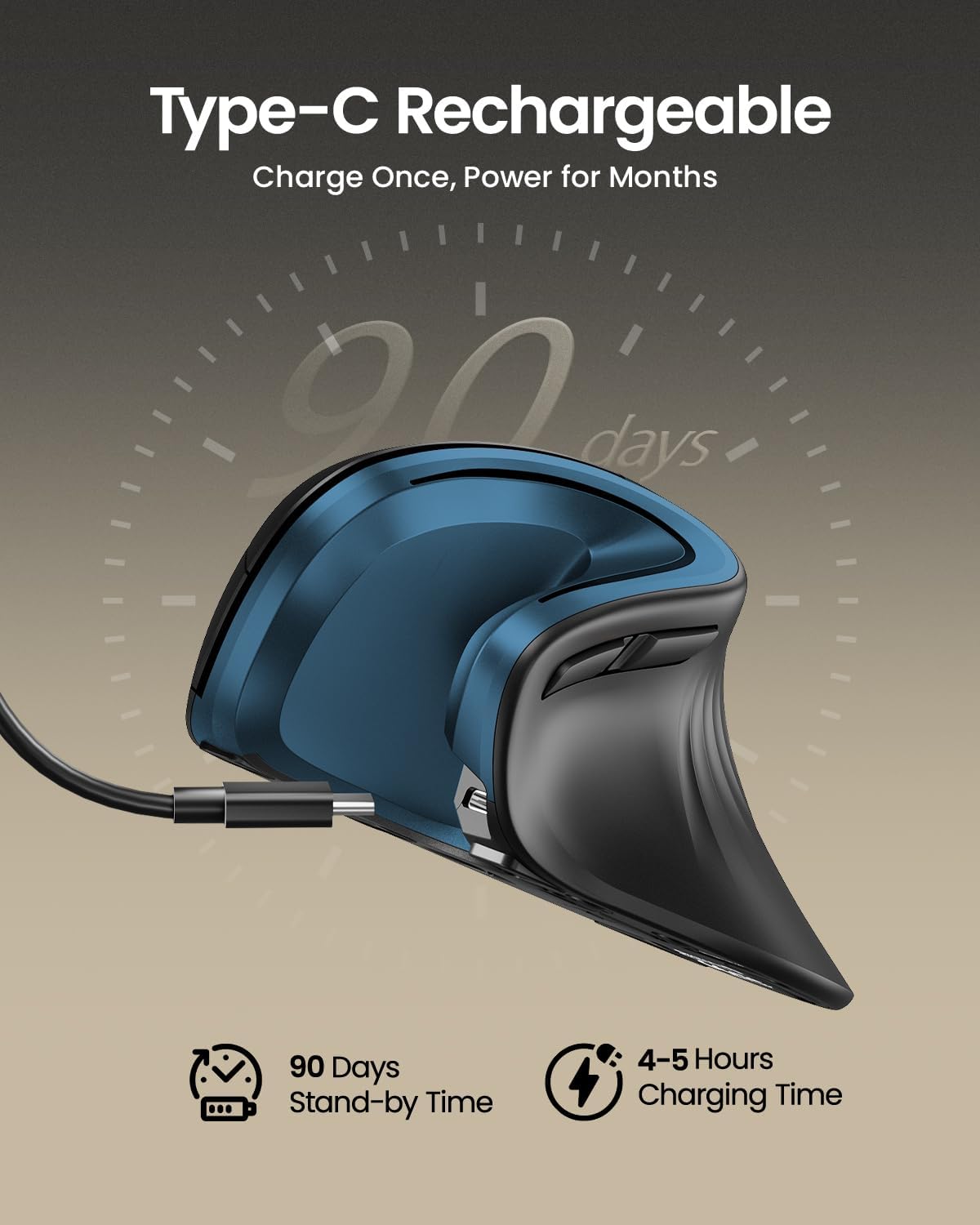 - Rechargeable Ergonomic Mouse: The Bluetooth Vertical Mouse has a built-in 500mAh Li-Ion battery that can be conveniently recharged using the included Type-C cable
