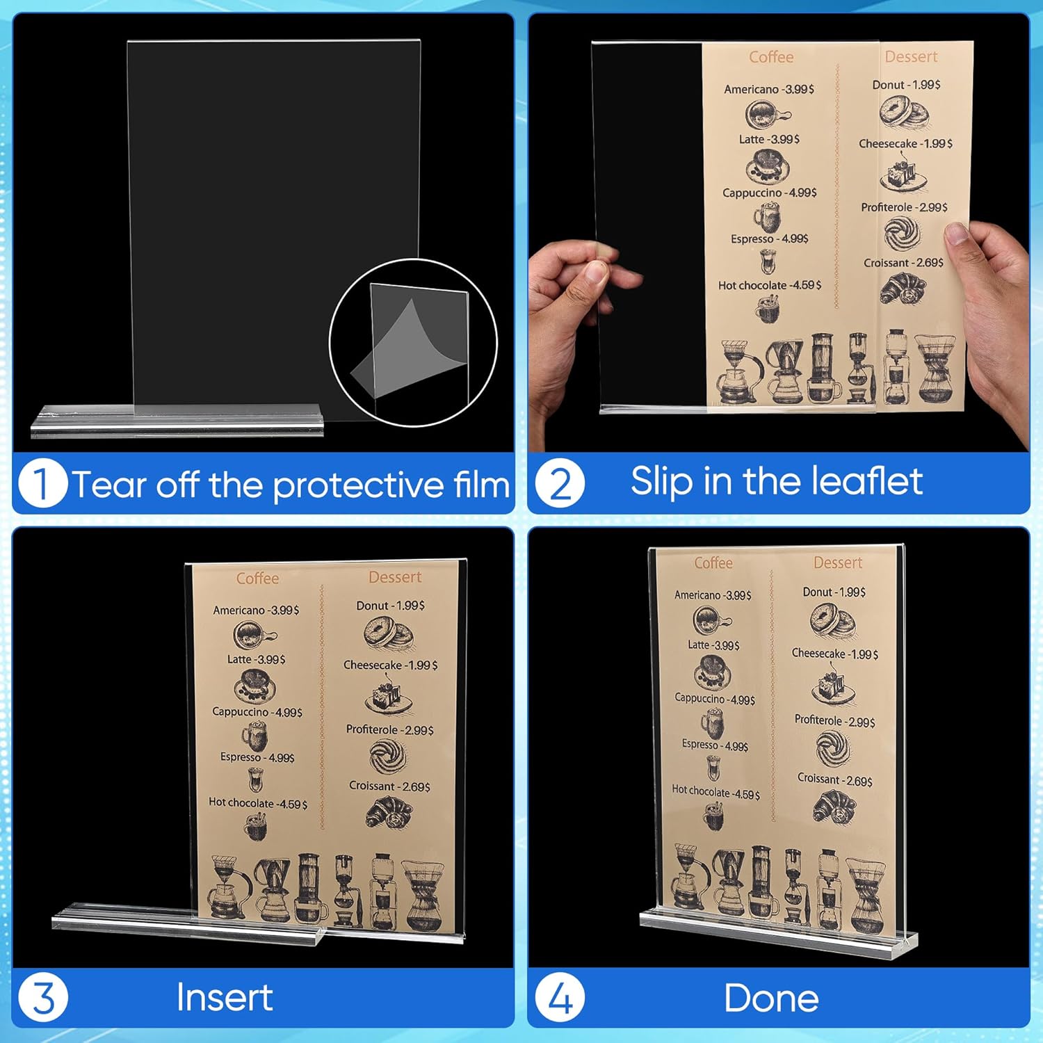 - Acrylic Sign Holder Versatile Applications: Ideal for displaying advertisements, menus, flyers, and brochures in homes, restaurants, offices, weddings, trade shows, and more.