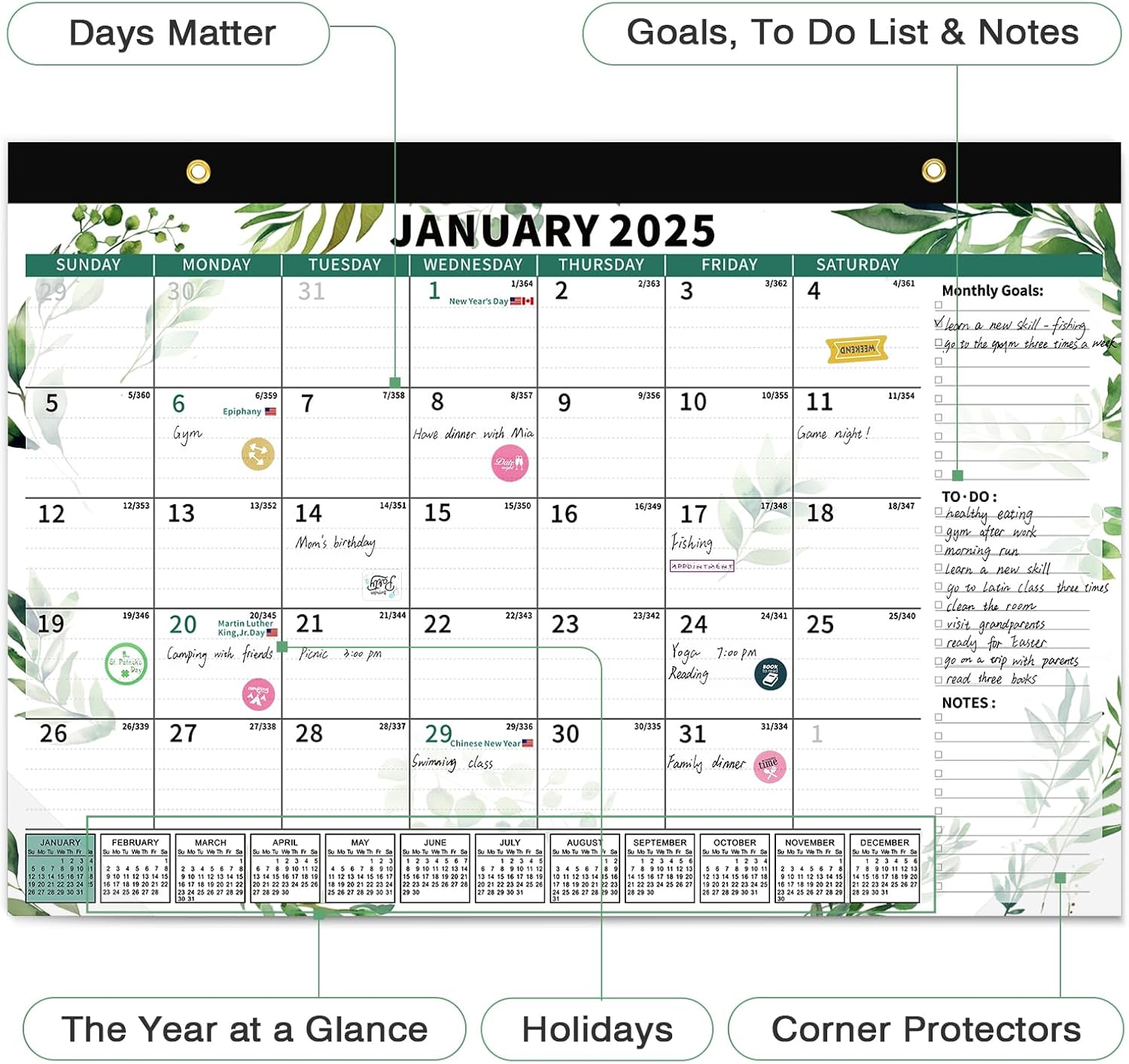 Ospelelf Desk Calendar 2025-2026, Magnetic Fridge Wall Calendar, 18 Month Monthly Large Calendar Planner with Plastic Cover Floral 17" X 12" Green Leaves