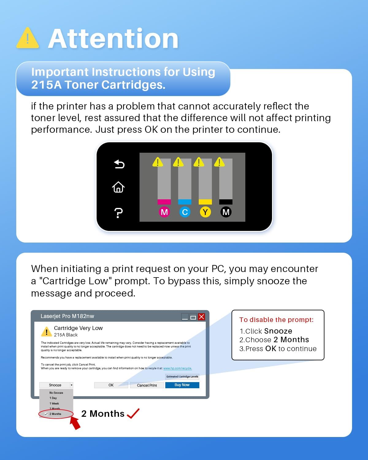 - With Chip: Skydo toner cartridges 4 pack replacement for 215A Toner Cartridges High Yield Set with Chip, No need to remove and install old OEM chip on this replacement for 215a toner cartridges (This is not an OEM product)