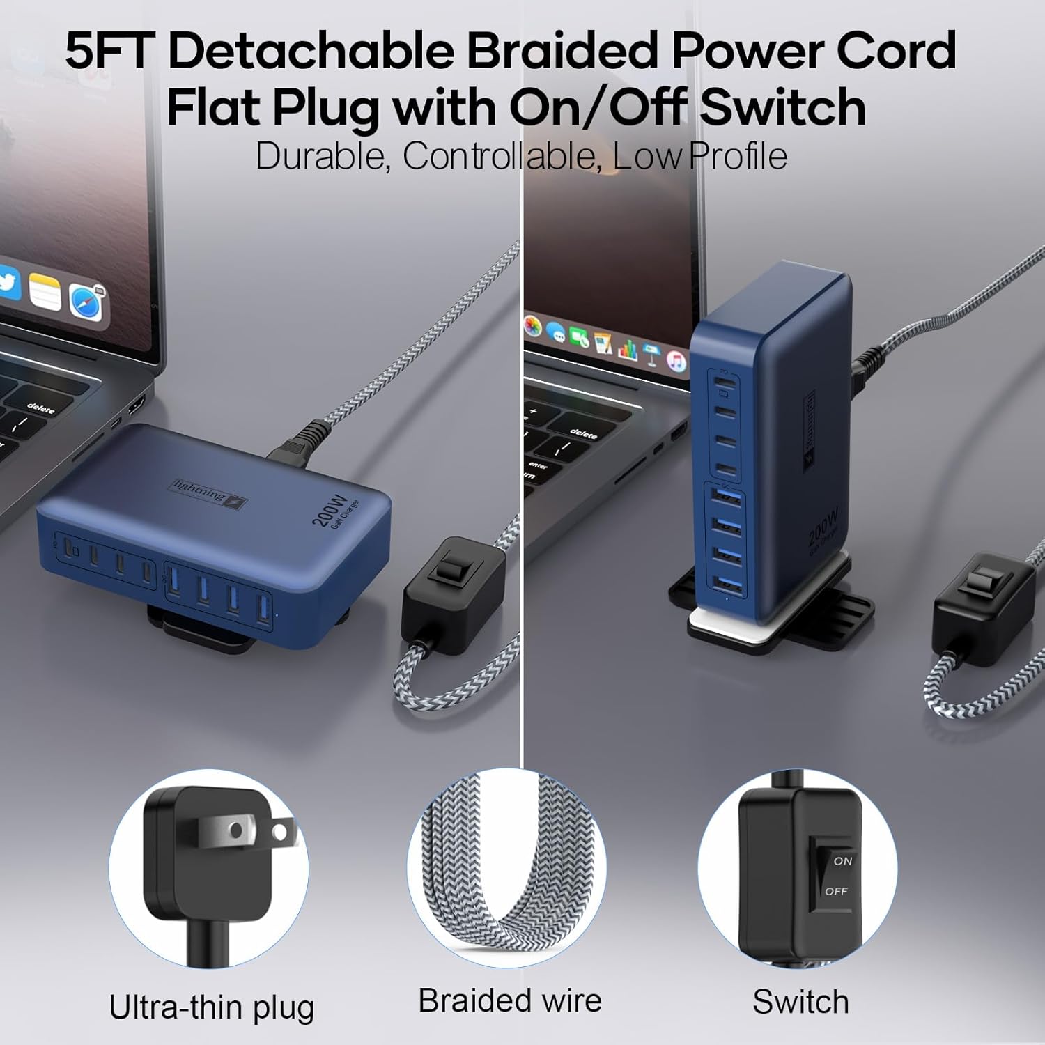 8-Port iPhone Charger Fast Charging 200W with Flat Plug, Braided Power Cord, and On/Off Switch- USB Charging Hub for iPhone, iPad, MacBook and More- 65W C Port Power Adapter for Laptops