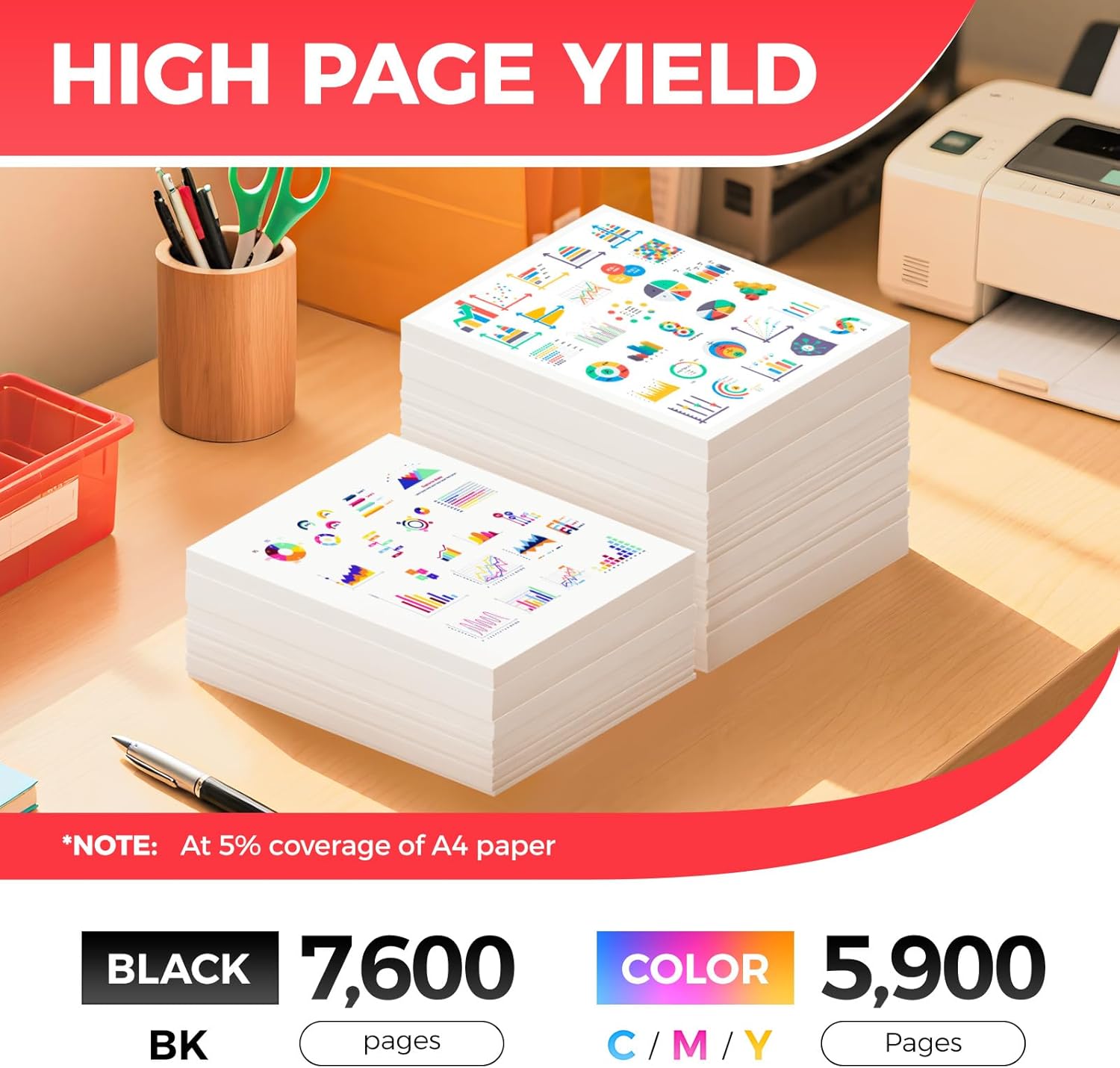 - High-Yield: up to 7,600 pages per T09 Black and 5,900 pages per T09 Color (Total 25,300 pages, 5% coverage).