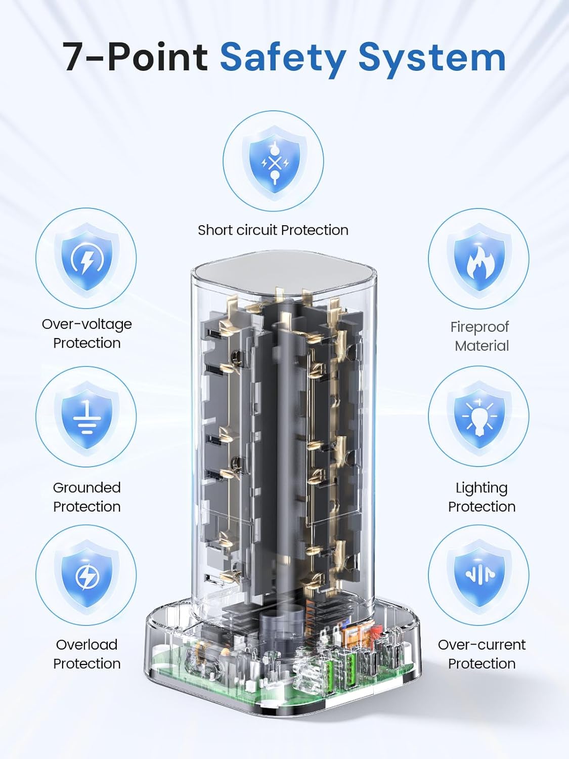- 【Surge Protector Tower】With overload protection, short-circuit protection, and over-current protection, this device ensures your electronics stay safe. The dependable on/off switch automatically disconnects power, safeguarding your valuable devices and creating a secure charging space. Additionally, multilayer extension cords enhance safety and durability.