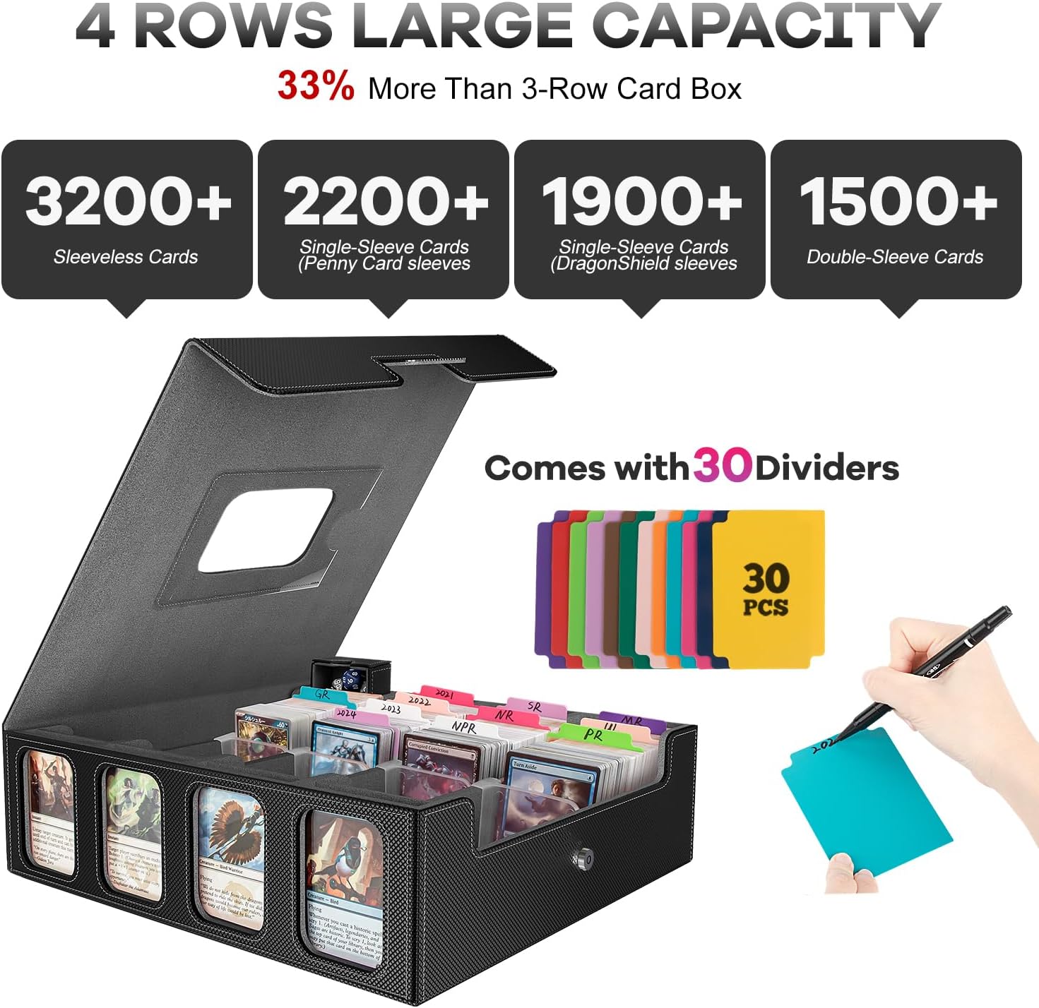 - 3200 Large Capacity - With an upgraded 4-row design, this trading card storage box increases capacity by 33.3%. Size 12.6 x 12.6 x 3.9 inches, it holds over 3200+ unsleeved cards, 2200+ Penny-sleeved cards, 1800+ Dragonshield-sleeved cards or 1500 double-sleeved cards