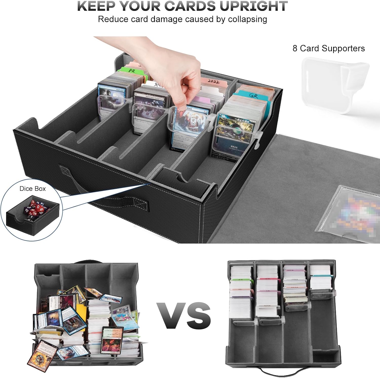 3200+ Trading Card Storage Box with Commander Display, 4 Row Card Deck Box with Portable Handle, Compatible for TCG/MTG/Magic Cards, 30 Colorful Divider, 8 Supporters, US Design Patent (Black&Grey)