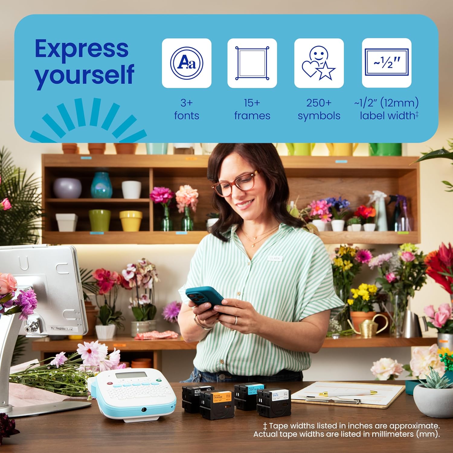 - ENDLESS EXPRESSION: Pre-loaded with 3 fonts in 7 styles including underline & italic; 15 frames, 250 symbols; free design app with more templates, and personalization options; prints up to two lines of text with a combined height of 9mm per label