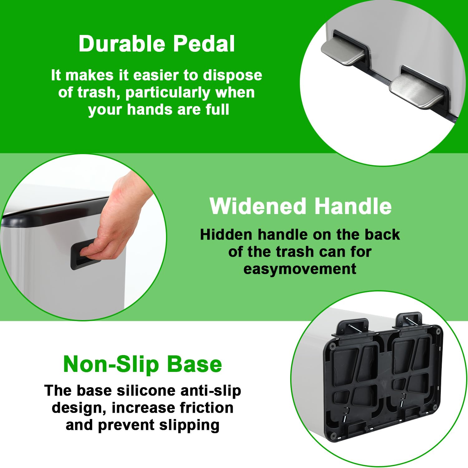 - Labor-saving Operation & Quiet Soft Close: The trash can has two separate ergonomic pedals that gently open the corresponding lid and are also easy for children to use. What's more, when the foot pedal frees the hands, the plastic cover not only effectively inhibits the odor in the bucket, but also has a noiseless buffer device for slowing down, which will not affect the quiet environment.