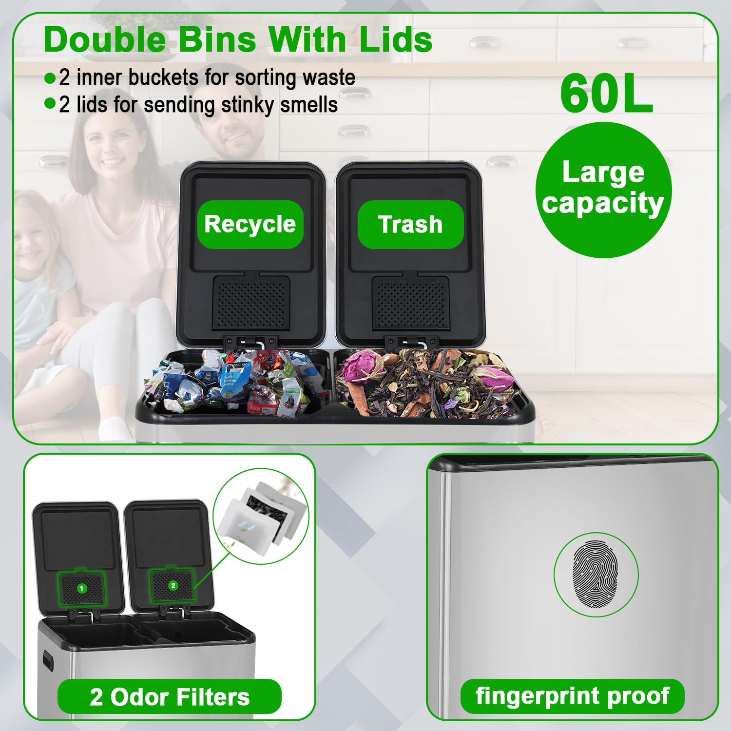 - 2 Buckets: Our trash can measures 20.3in * 14.6in * 26.2in, with a large capacity of 60 liters and a small footprint. It features a foot pedal design, 2 inner bins for waste sorting, and 2 odor filters.
