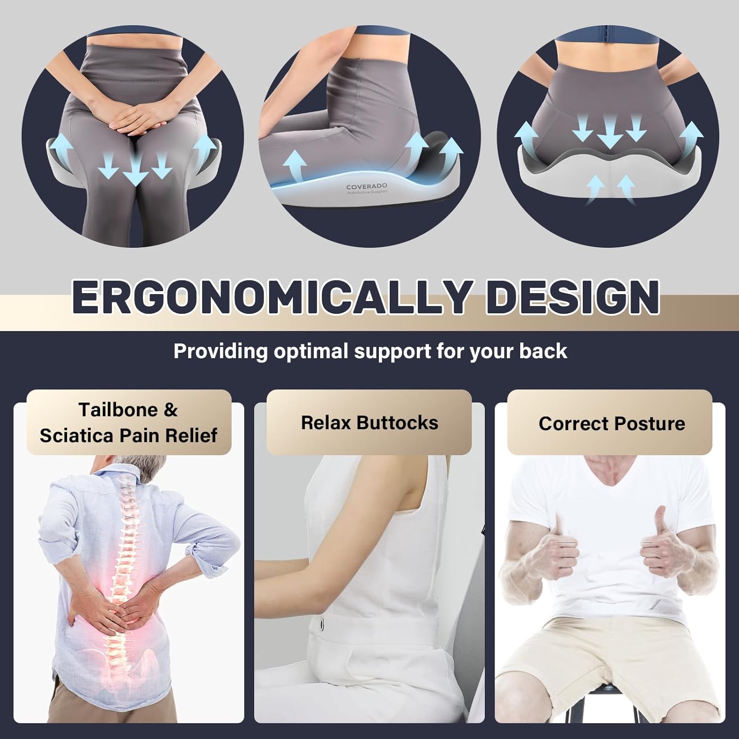 Coverado Car Seat Cushion for Car Seat Driver/Passenger, Memory Foam Seat Cushions for Office Chairs, Tailbone Pain Relief Cushion, Sciatica & Back Support Black&Gray