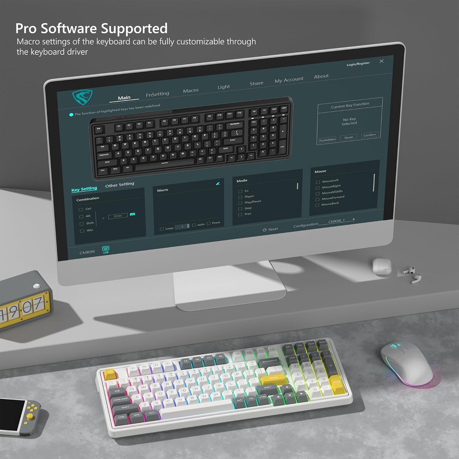 - 【Programming Macros & PBT Keycaps】CMK98 is a premium mechanical keyboard for both work and game. All keys support macro customization, which allows macro recording and editing, customize key function and supports cool music rhythm lighting effects with driver. N-key rollover, keyboard can respond to multiple key presses at the same time, which is helpful in very exciting real-time games. Double shot PBT keycaps, made from two colors material molded into each others, make the keycaps characters maintain the vibrance and saturation, clear and not fade.