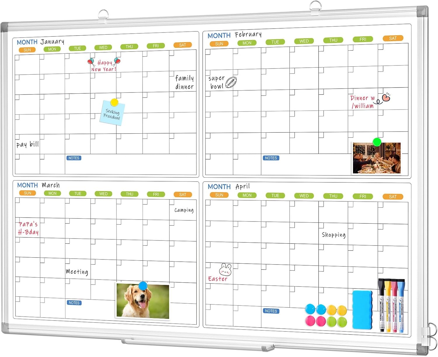 - 【Super Value Pack Included】Our calendar board comes with all the accessories you need—no additional purchase required. The set includes 4 markers (4 colors), 8 magnets, 1 dry erase eraser, a detachable tray, movable hooks, and wall-mount screw kits. Get started on your schedule planning right after unboxing.