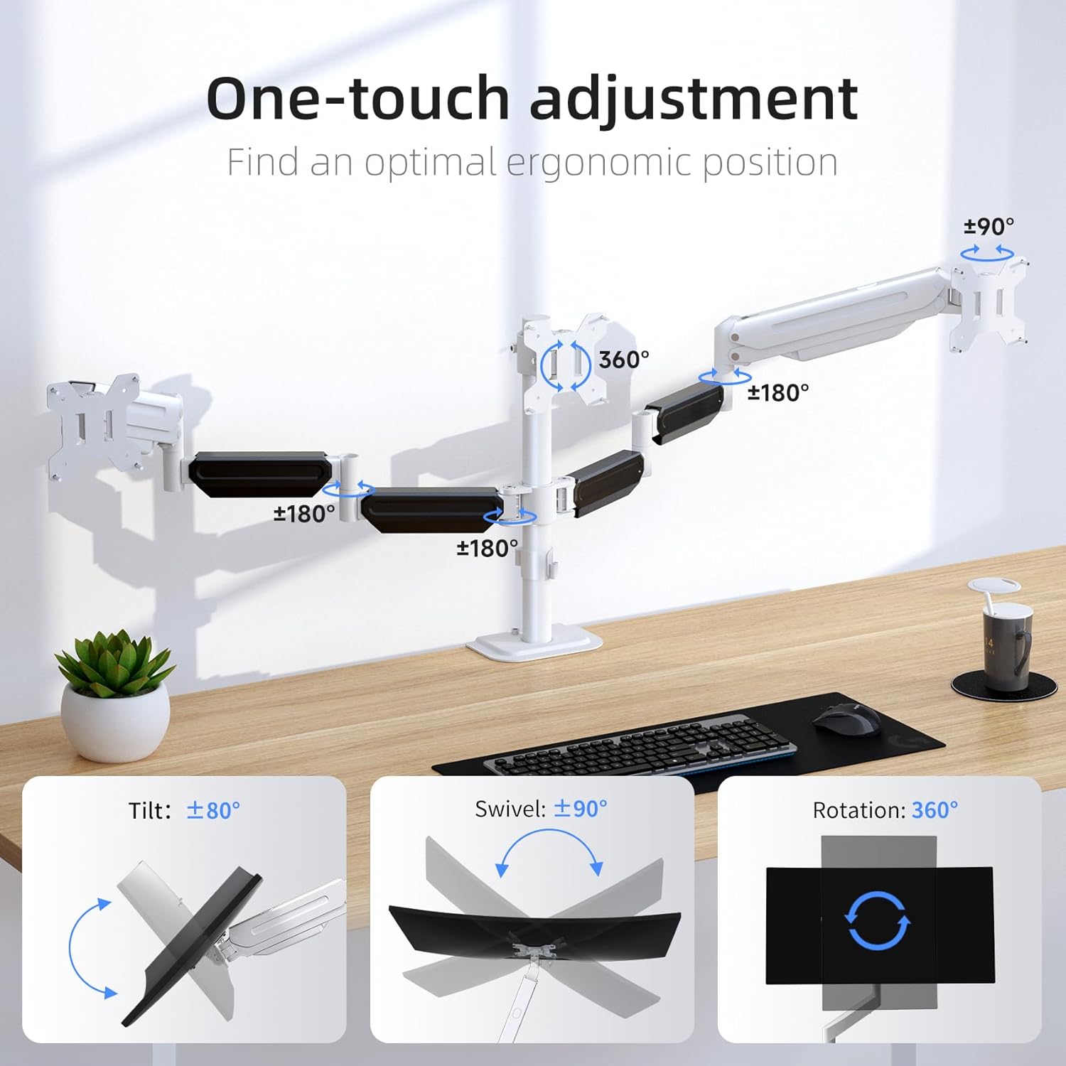 - Ultimate Desk Space Saver: The three monitor mount get displays off your desk conveniently, and the standing pole design helping you to gain a ton of extra space. Integrated cable management to keep cables tucked in arm neatly, hide the sore eyes wire clutter.