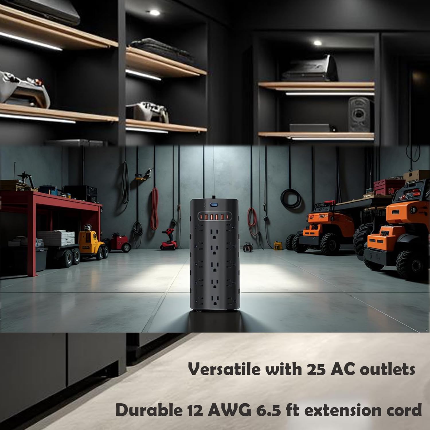 - 20 Amp Power Strip Surge Protector with 25 AC Outlets and 6 USB Ports, ensuring all your devices are powered and charged efficiently.