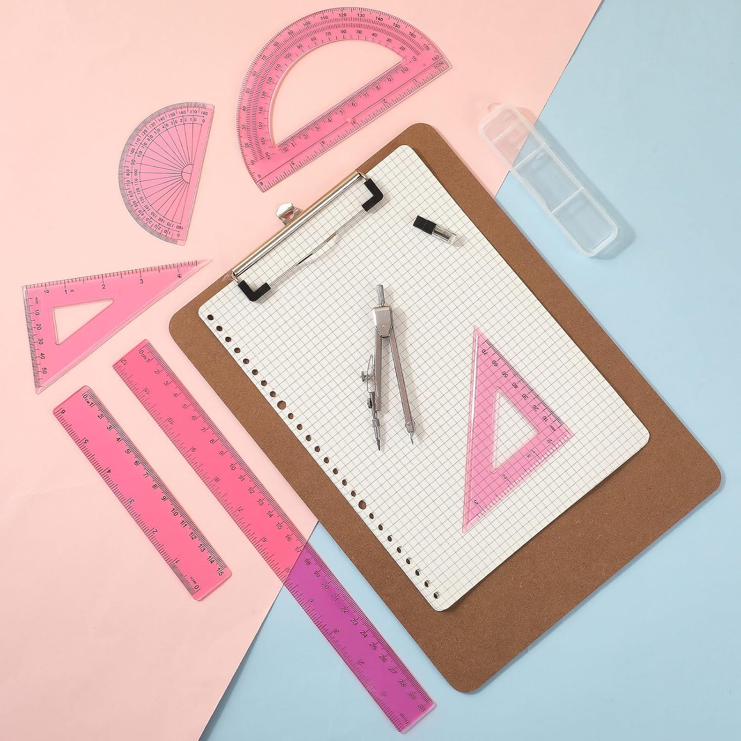 Zonon 1 Set Plastic Geometry Math Set Includes Drawing Compass, 6 Inch 4 Inch Protractor, 45/60 Degree Triangle Rulers 12 Inch 6 Inch Math Ruler Transparent for Office Supplies (Pink)
