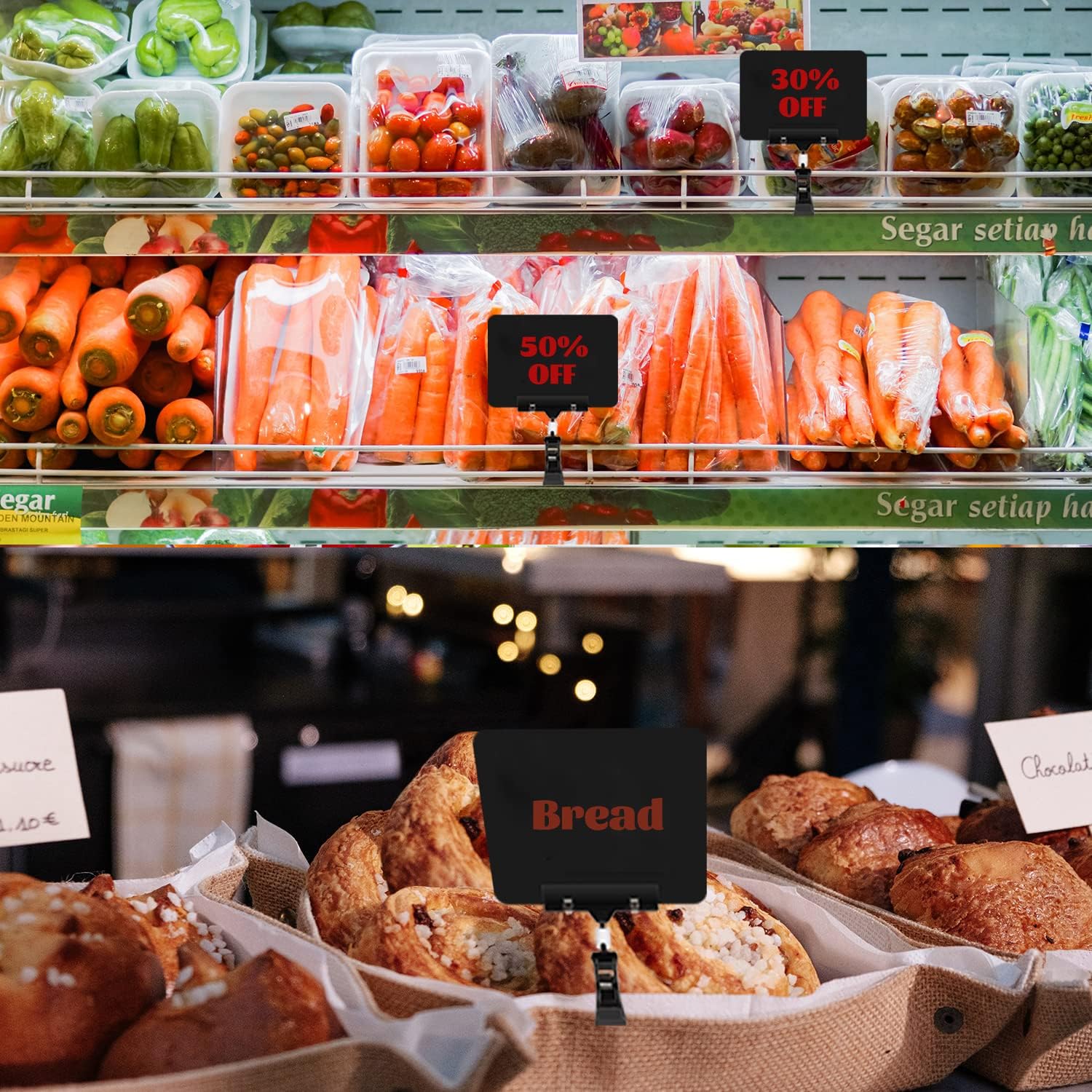 - 【Double Head Swivel】- The sign clips for display are 360°rotatable for flexible use and with double clips design, one clip for displaying signs, one clip for fix on the shelf, rack, or basket.
