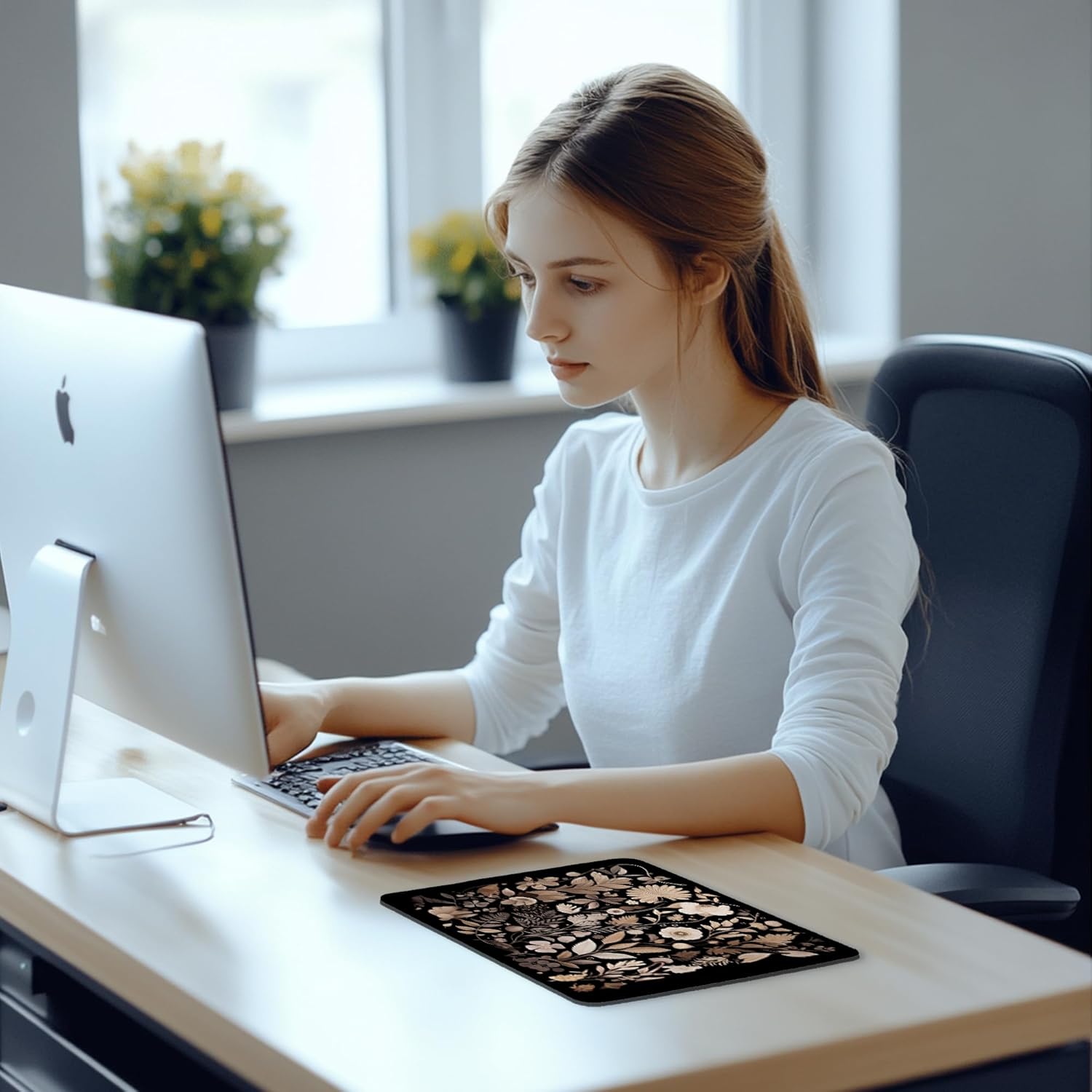 Floral Black Mouse Pad - Vintage Floral Decor Mousepad, Black Boho Flower Office Desk Mouse Pad, Boho Coworker Gifts, Gifts for Flower Lovers, 9.5x8 Inches