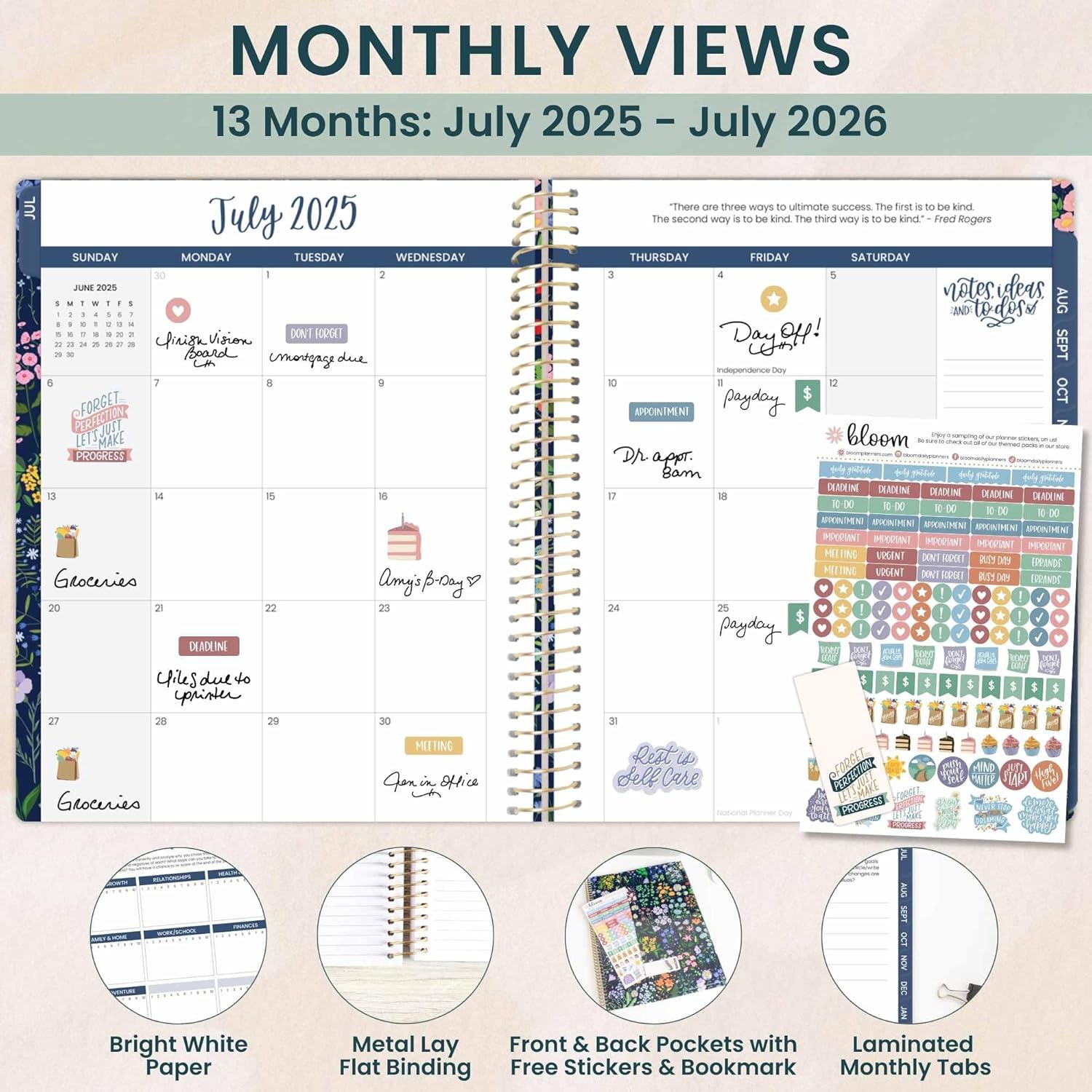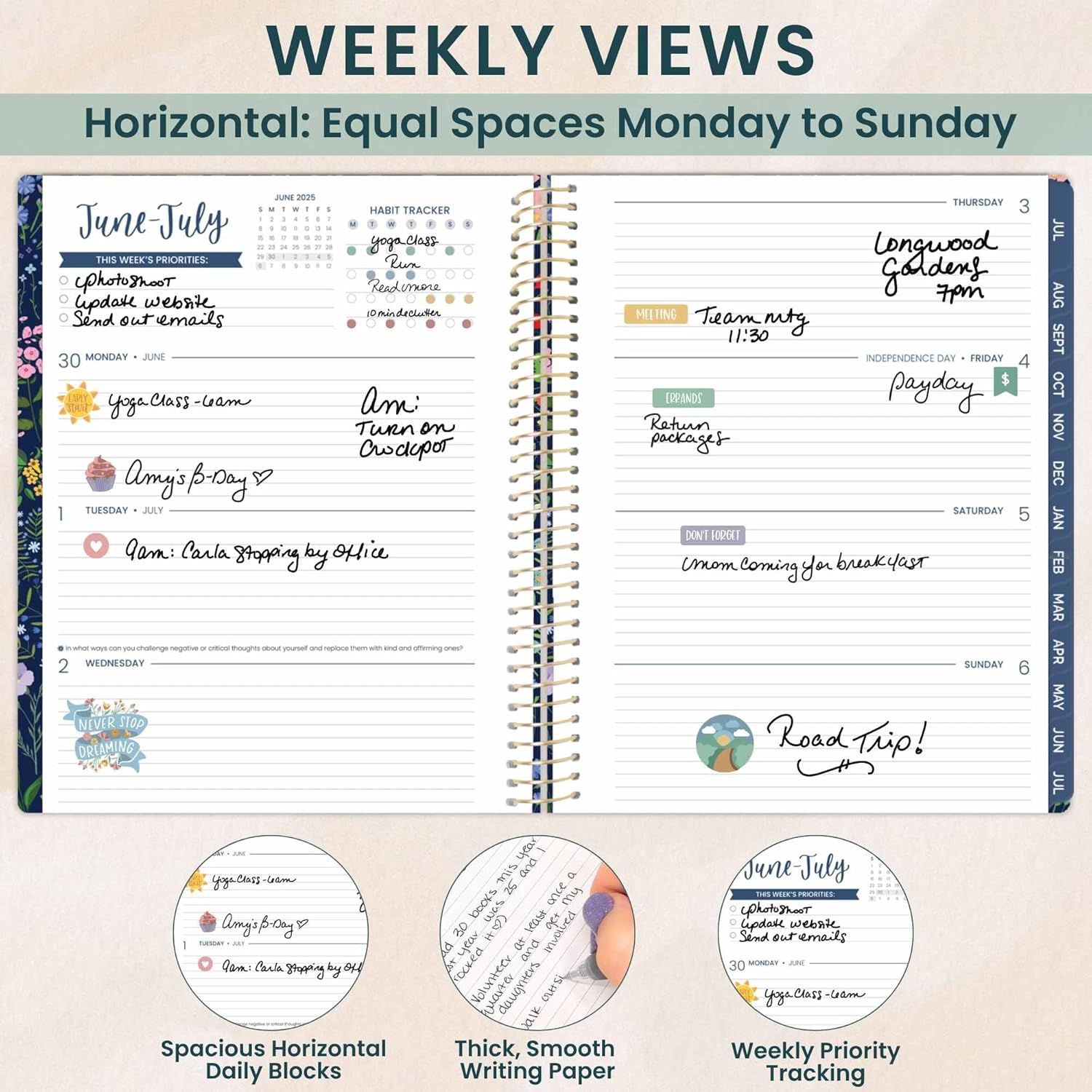 - 8.5” x 11” WITH HORIZONTAL WEEKLY LAYOUT & MONTHLY VIEWS: 2 page monthly overview spreads and spacious weekly views run Academic Year, July 2025 through July 2026. Weekly views are horizontal and include priority & habit tracking.