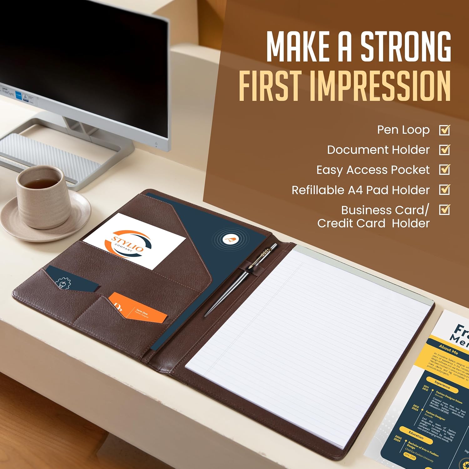 - ✅ STYLE MEETS FUNCTION – Elegant design featuring convenient, safe pockets ideal for documents, business cards, travel tickets, pitch proposals & resumes. Includes a pen holder & refillable writing pad