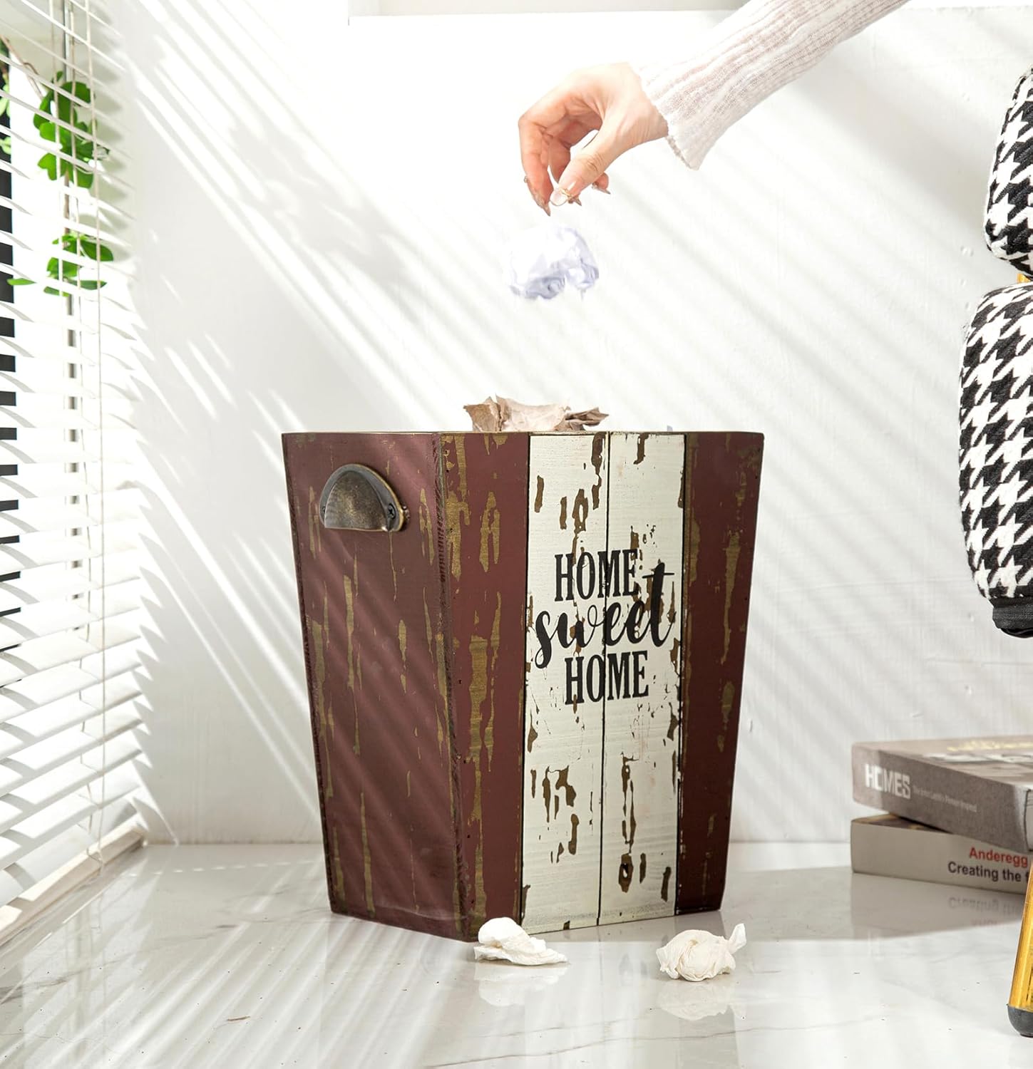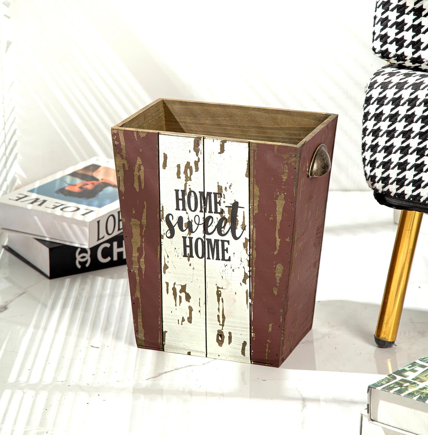 - UNIQUE DESIGN – Each wastebasket is delicately handmade, which is rust red and white distressed finish with double-sided letters of [Home Sweet Home], great for adding endless warmth and rustic flair to your space.