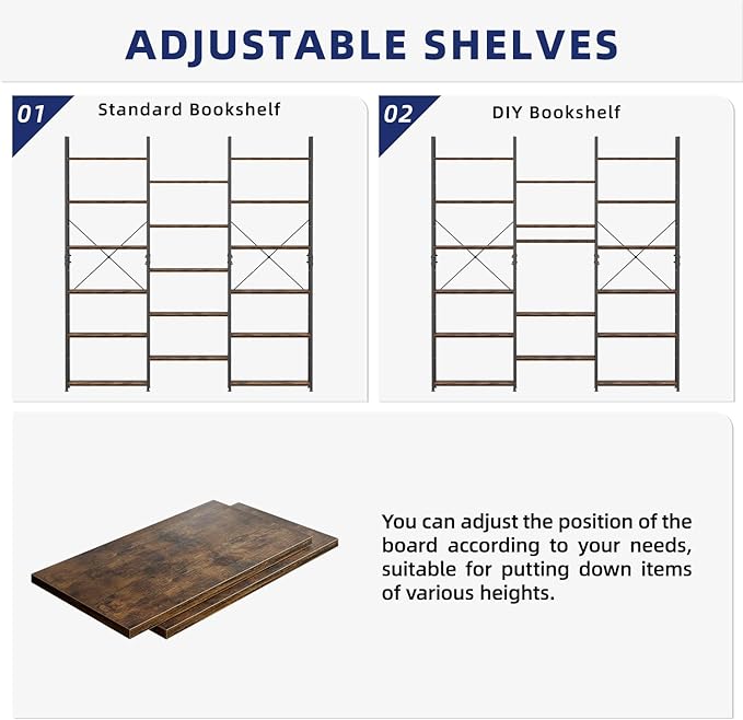 NUMENN Triple Column 6 Tier Bookshelf, Bookcase with 17 Open Display Shelves, Adjustable Rustic Industrial Style Book Shelves, Modern Bookshelves for Bedroom, Living Room and Home Office, Vintage