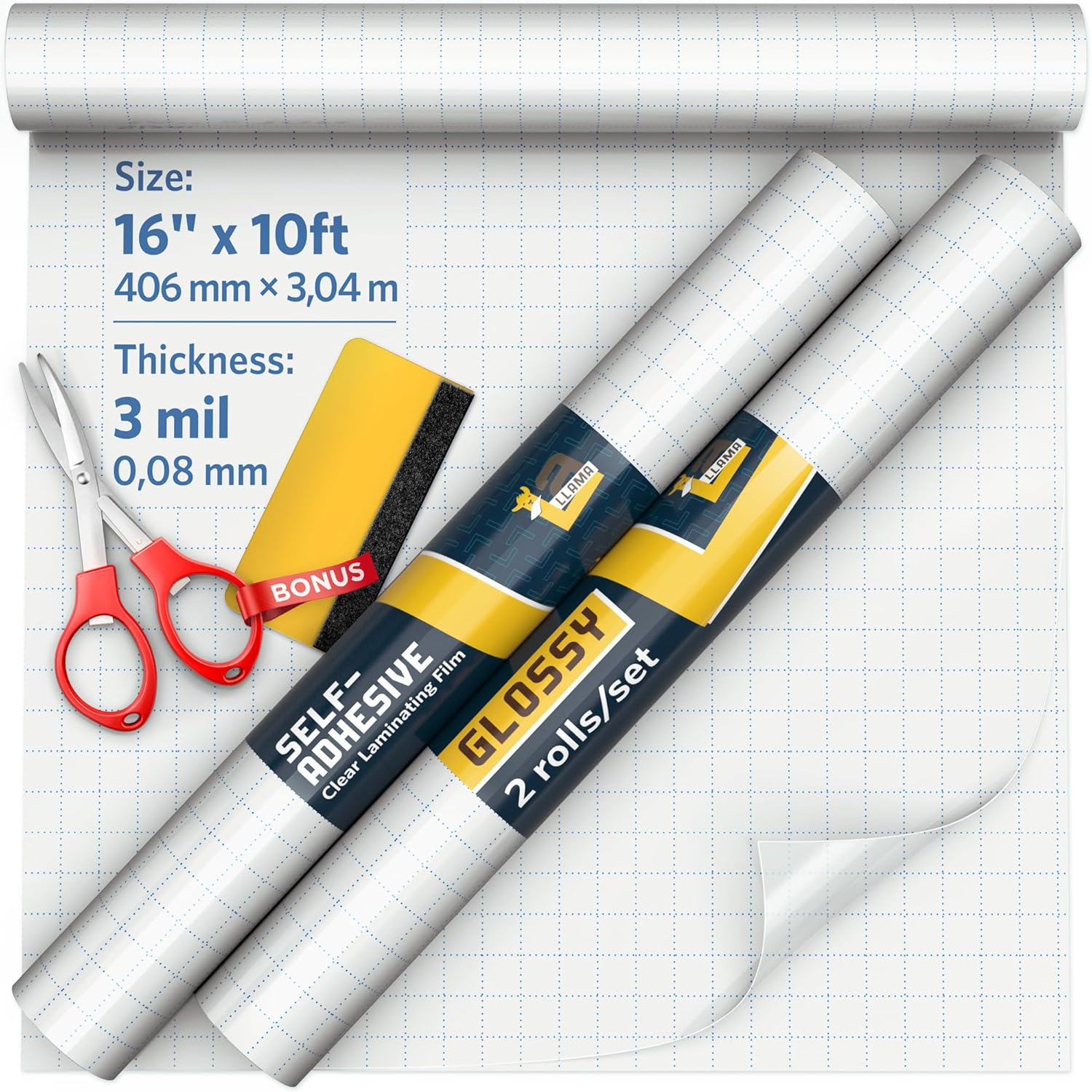 - 🦙User-Friendly and Versatile: Designed for ease, this durable laminating film roll 3 mil effortlessly, ensuring smooth, bubble-free application. Use it as clear contact paper for crafts, removable contact paper, or for protecting documents, photos, and other creative projects. Don`t forget about the BONUSES INCLUDED. Among with clear laminating roll you get foldable scissors and scraper.