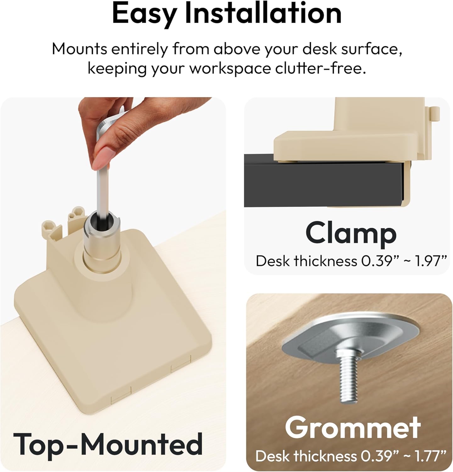 - Desk mounted design: Frees up valuable desk space, creating a more organized and spacious work area. Choose between a C-Clamp configuration (default) or by grommet installation.