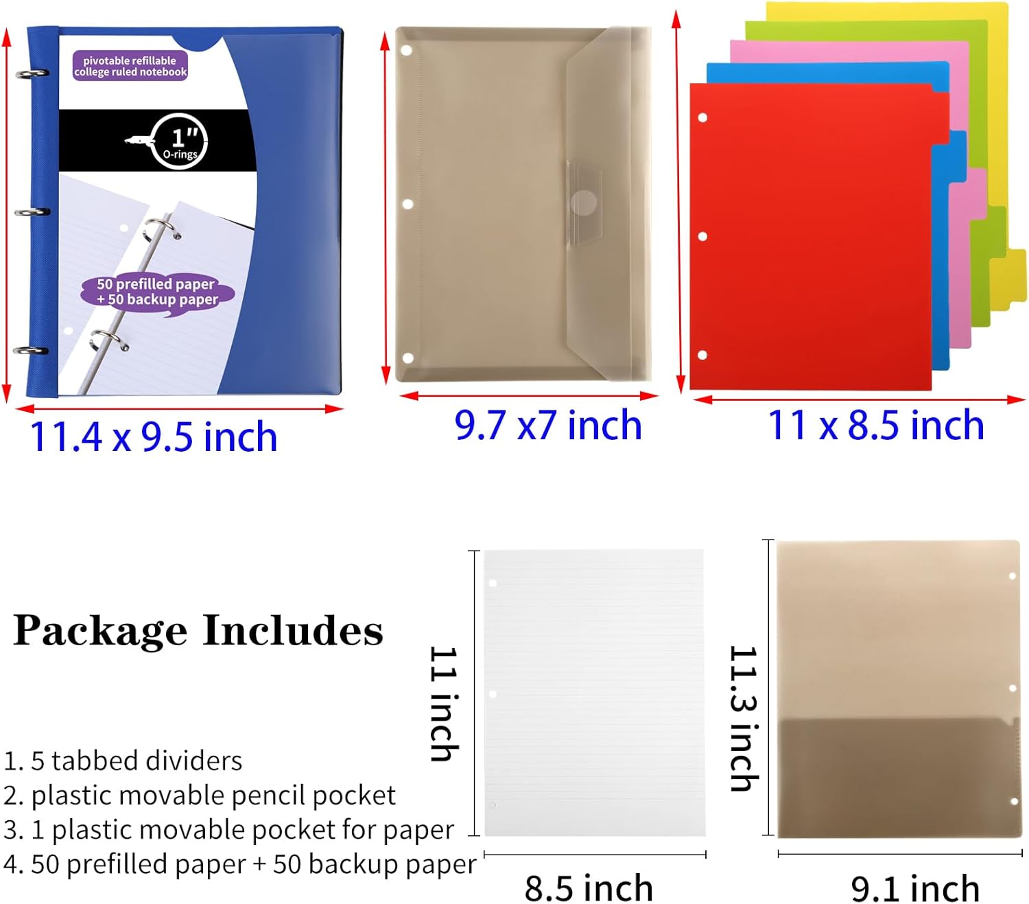 - This notebook with dividers and pockets comes prefilled with 50 pieces of 8.5"x 11" college ruled paper, 50 backup papers, 5 colored tabbed dividers,1 semi-transparent divider with 3 pockets, and 1 movable pencil pocket. This 3 ring notebook dimensions are 11.4" x 9.5". Normally, in back-to-school season, you need to buy 5 subject notebooks and 1 binder, but now, with this all-in-one notebook, you only need to bring one, which can greatly save your backpack space.