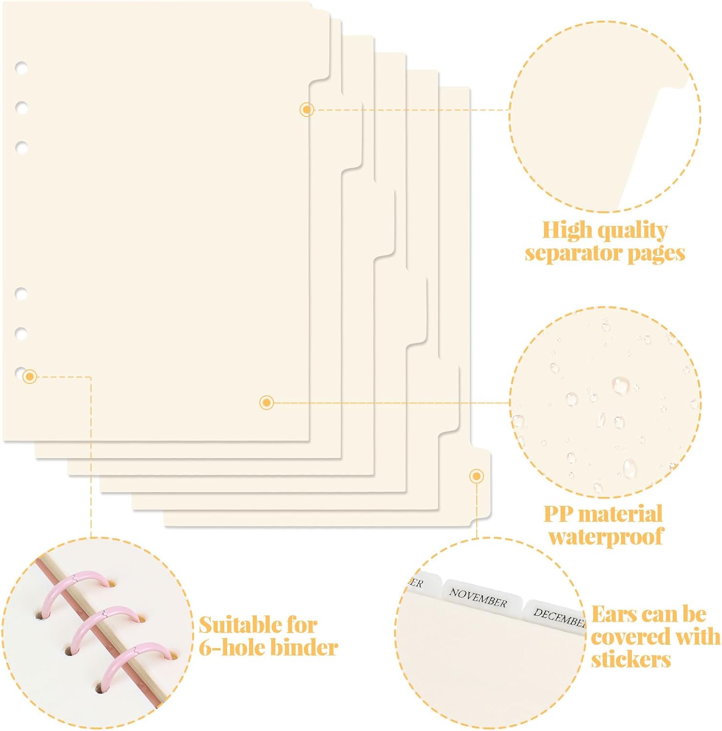- Package: 6 sheets of beige a5 6-ring dividers.