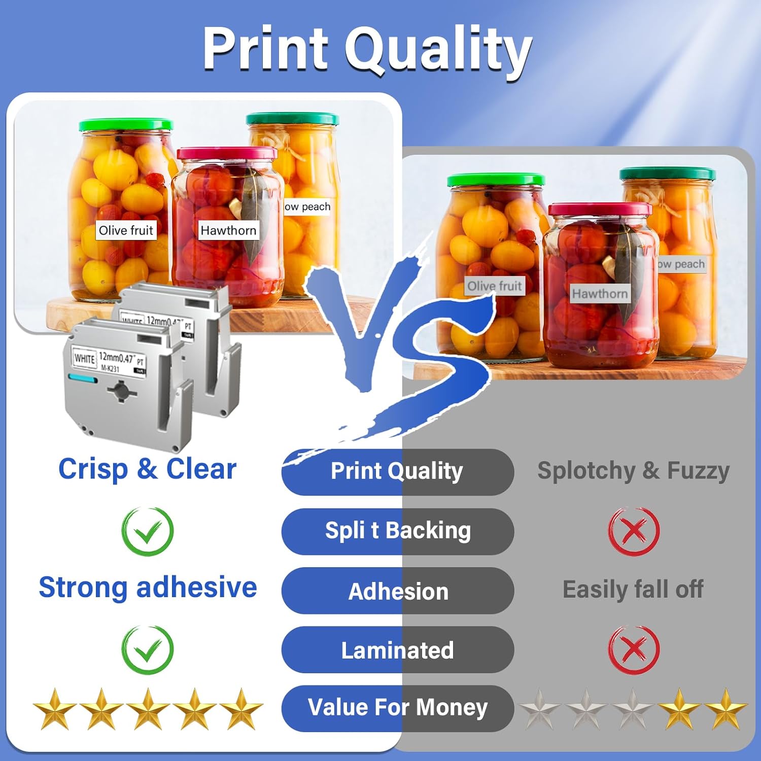 - Features: The m-k231 m compatible tape for brother label maker is purposely designed a slit in the middle and take tape 2 parts. It's easy to peel from the middle than from the Side. Strong adhesive and no sticky residue remains when removed