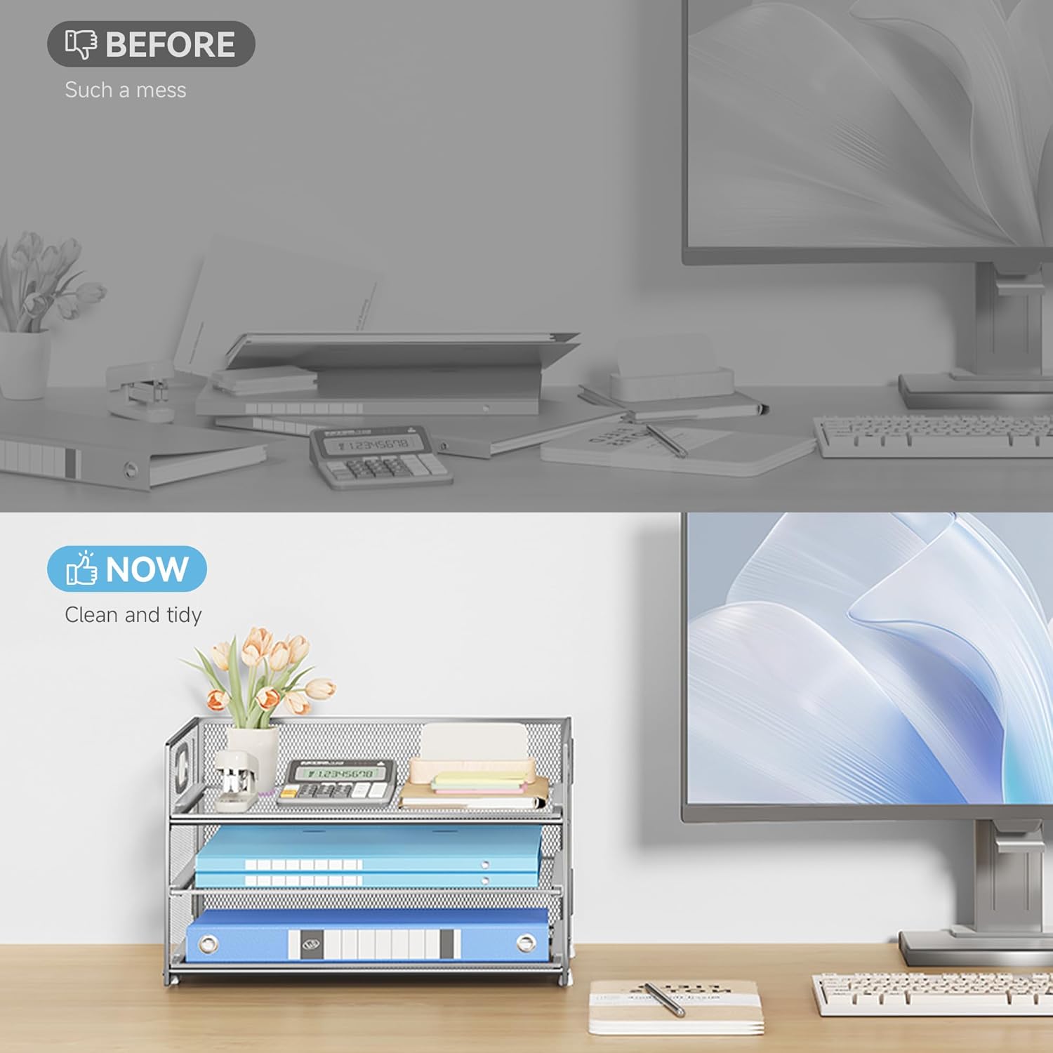 - Paper Organizer Function and Usage: The mesh desktop file organizer can hold various items including paper, folders, books, bills, notebooks, etc. The open design enables quick identification and access to contents, helping to declutter and organize the desk