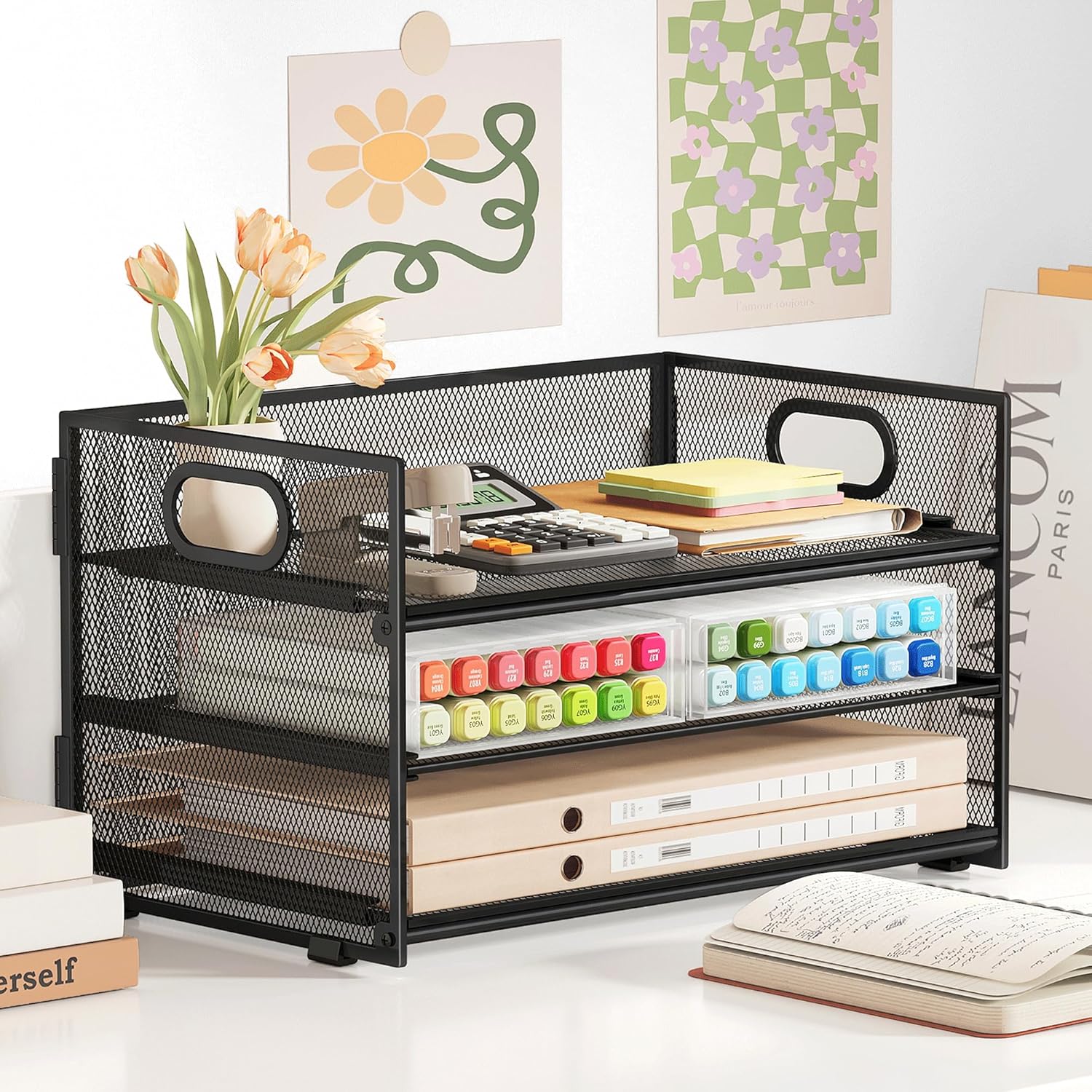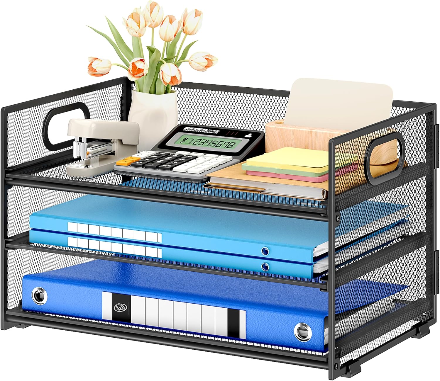 Subekyu 3 Tier Paper Letter Tray Organizer for Desk, Black Metal Mesh Desk File Folder Sorter Organizer with Handle and Sliding Tray for Home, Office, School Supplies Organization Storage