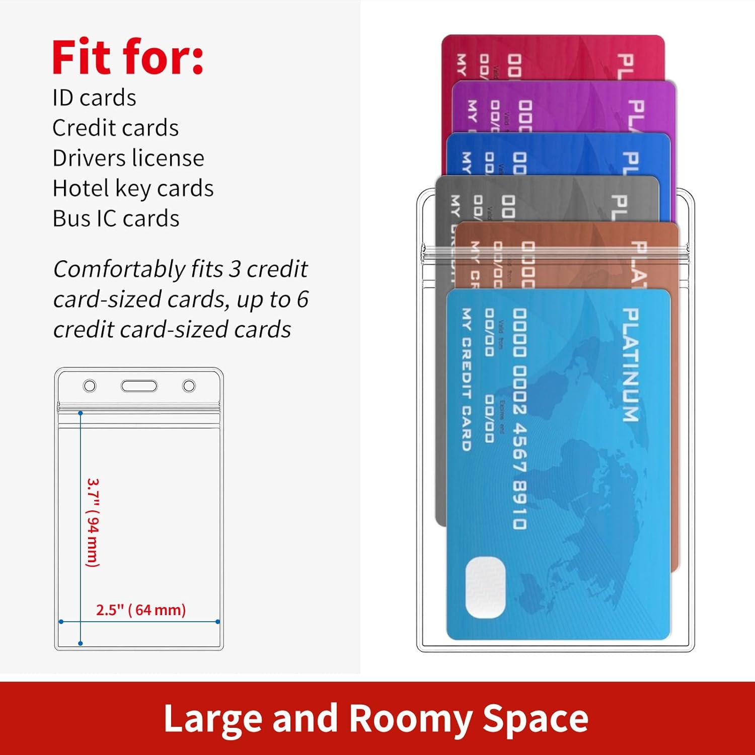 - Flexible Multi-purpose Design: Clear ID card holder features a resealable zip, making it waterproof and dustproof, ensuring the safety and dryness of your cards and money. 3 pre punched openings can attach almost all style lanyard