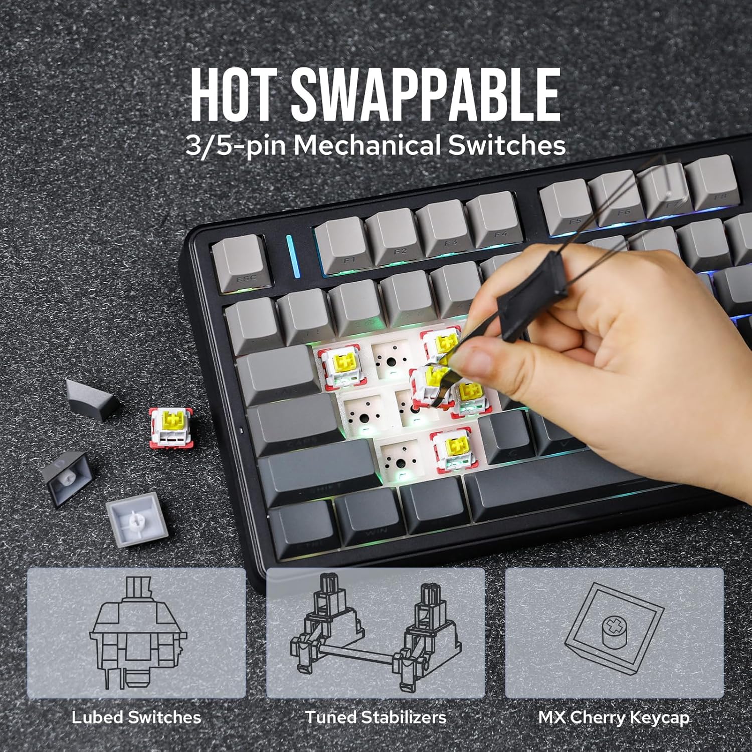 - Hot Swappable&Flex-Cut PCB and PC Plate: The Flex-Cut 1.2mm hot-swappable PCB and PC plate allow for a slightly flexible but stable typing experience. Each keystroke is buffered and accurate. The F99 PRO keyboard is compatible with 3-pin or 5-pin switches, and the hot-swappable PCB allows for easy switch replacement without soldering, allowing users to customize their typing experience with their preferred switches. Equipped with pre-lubricated and finely-tuned stabilizers and LEOBOG switches, it offers a smooth typing feel and a pleasing creamy mechanical sound
