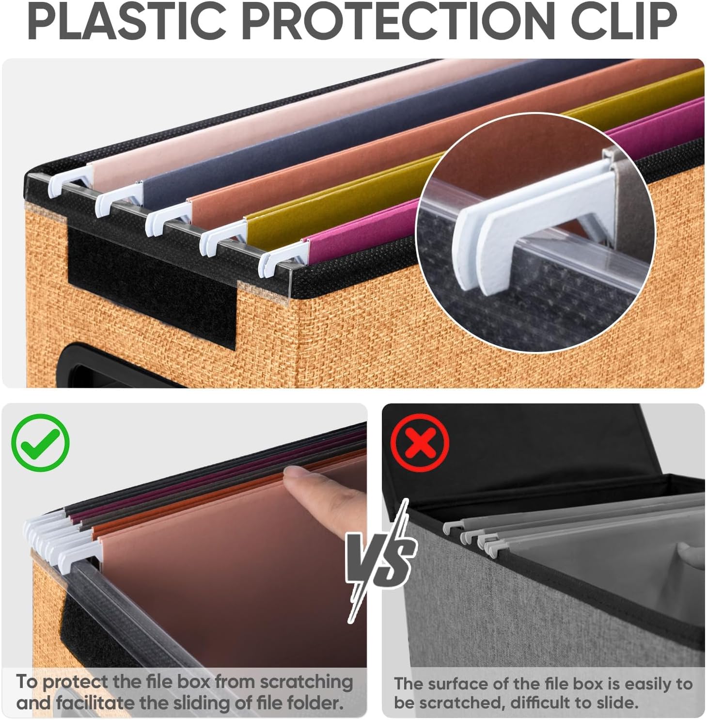 - [DURABLE MATERIAL] The outer layer of our filing box is crafted from high-quality polyester fabric and reinforced with thick cardboard in the middle. This construction ensures that the box maintains its shape and provides better bearing capacity for important documents and files. Its textured appearance can also serve as a stylish decorative element in any office or home