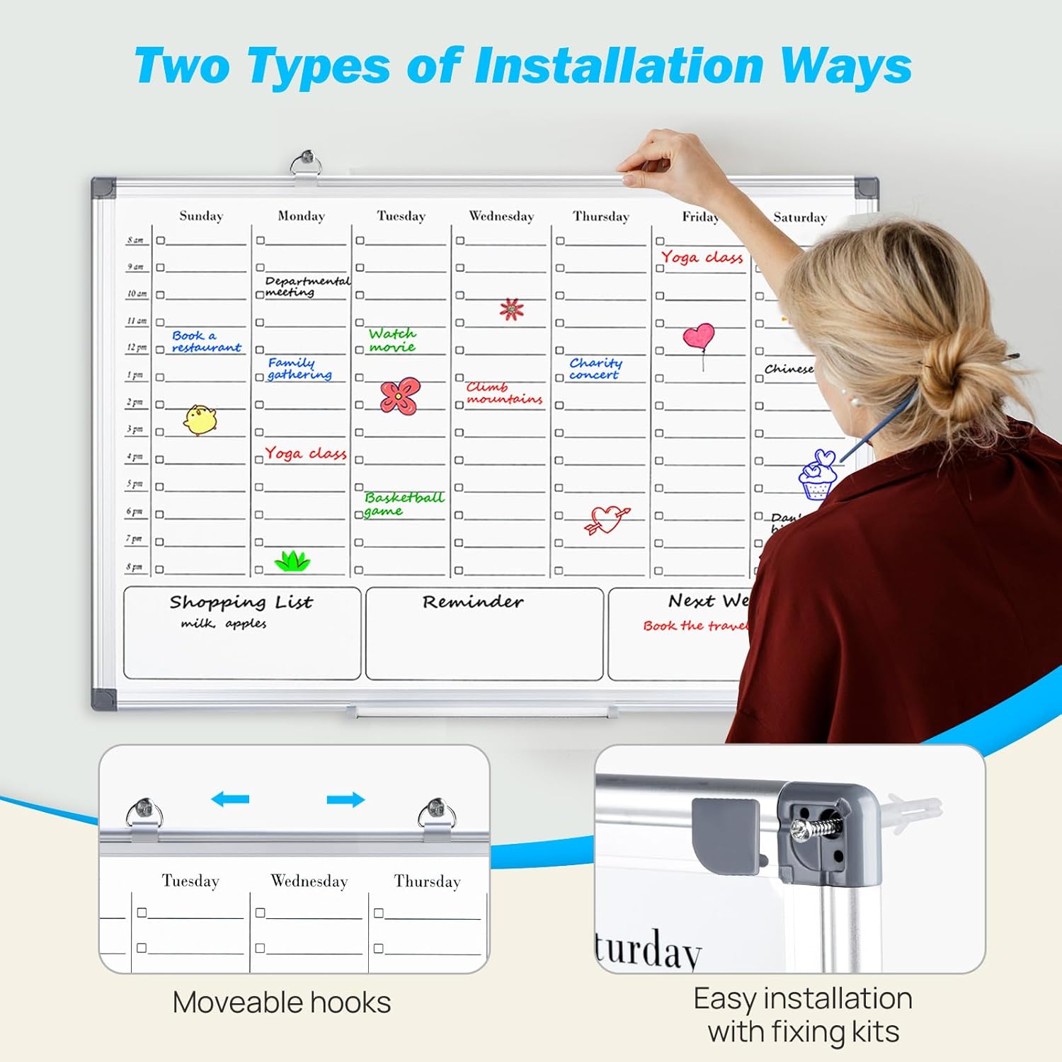 - 【High quality Details】The whiteboard frame is a sturdy and durable silver aluminum frame. The weekly dry erase board for wall is equipped with a detachable movable pen holder and the necessary hanging rings, nails, and nail concealed accessories for installation. Tip: 1、This whiteboard is not equipped with any pens or eraser! 2、Nail concealed accessories should be placed out of reach of children