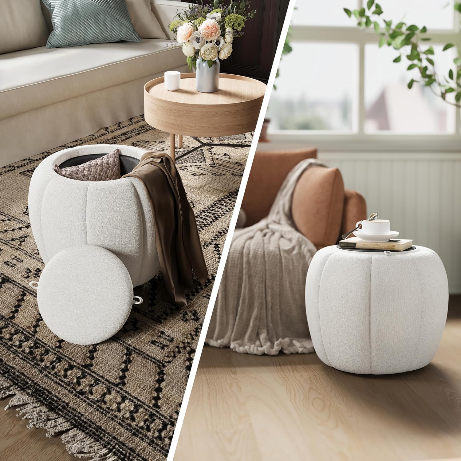 Storage Ottoman, Round Ottoman with Storage, Upholstered Soft Vanity Stool for Living Room, Foot Stool Ottoman for Bedroom, Entryway (Beige)