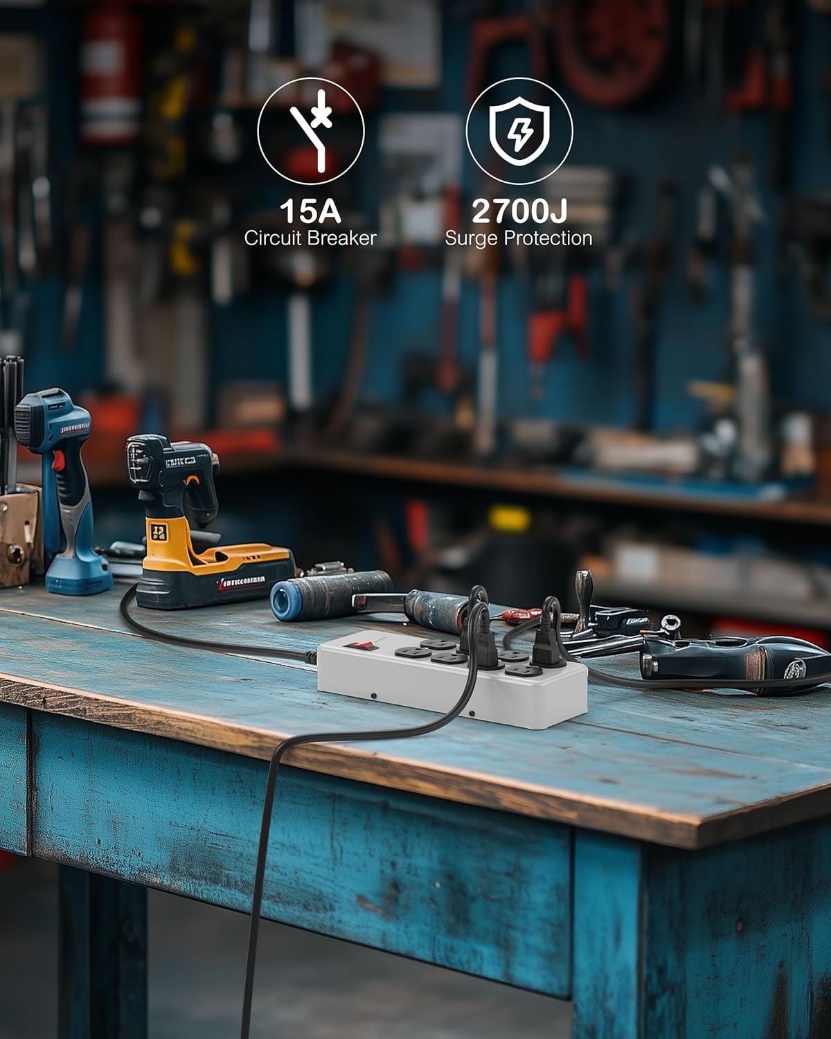 - High Capacity Powering: Equipped with 8 AC Outlets, this tool power strip surge protector has an electrical rating of 15A 125V 60Hz 1875W, combined with a 6ft 14AWG Heavy Duty Power Cord. It's the ultimate solution for all your power needs in heavy-duty settings, embodying the essence of a shop power strip heavy duty 15 amp.