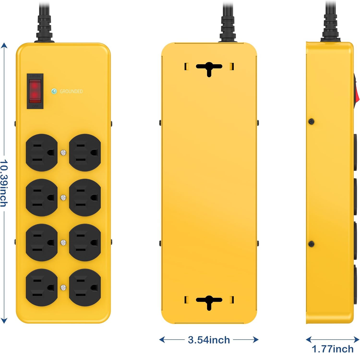 - Durable and Safe: The Metal Surge Protector Power Strip in Yellow boasts a robust, extruded aluminum housing, ensuring it can withstand harsh environments. With 8 outlets and advanced surge protection, this heavy duty power strip surge protector keeps your devices safe and powered in the most demanding settings, making it an ideal workshop or garage power strip.