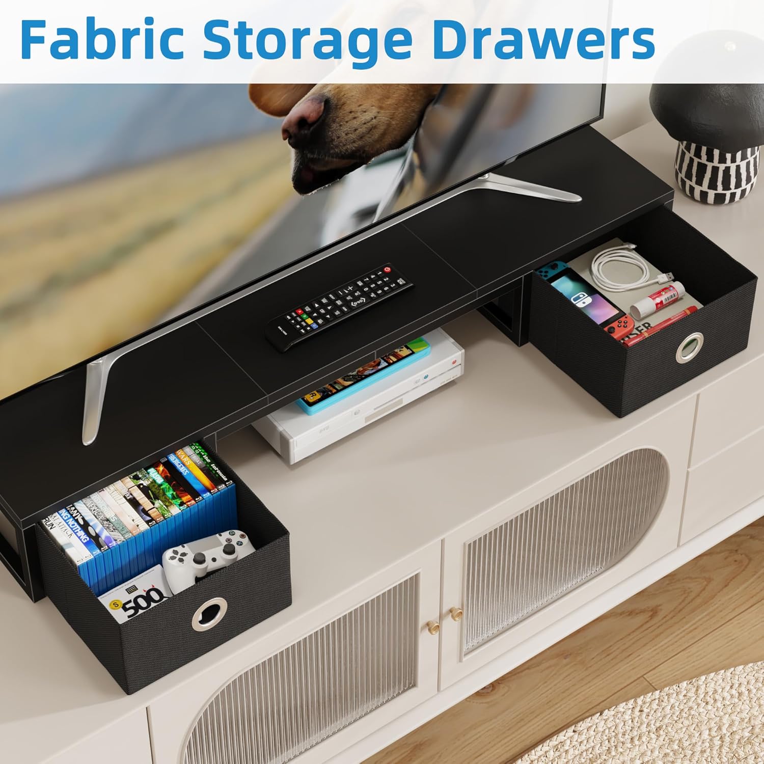 - 【TV Riser with Fabric Drawers】TV shelf design with 2 drawers, offer a privacy space to storage your media remote, CDs and magazines etc. Maximize your tabletop with this tv riser stand to maintain a clean, organized look.