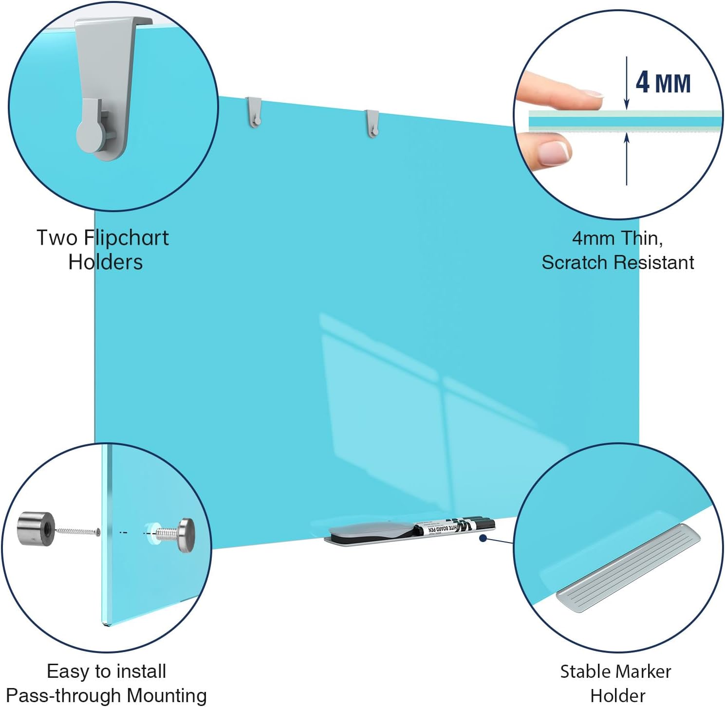TSJ OFFICE Glass Dry-Erase Board - 36 x 24 Inches Wall Mounted Magnetic Whiteboard, Large Frameless Glass White Board for Office, Home & School, Blue