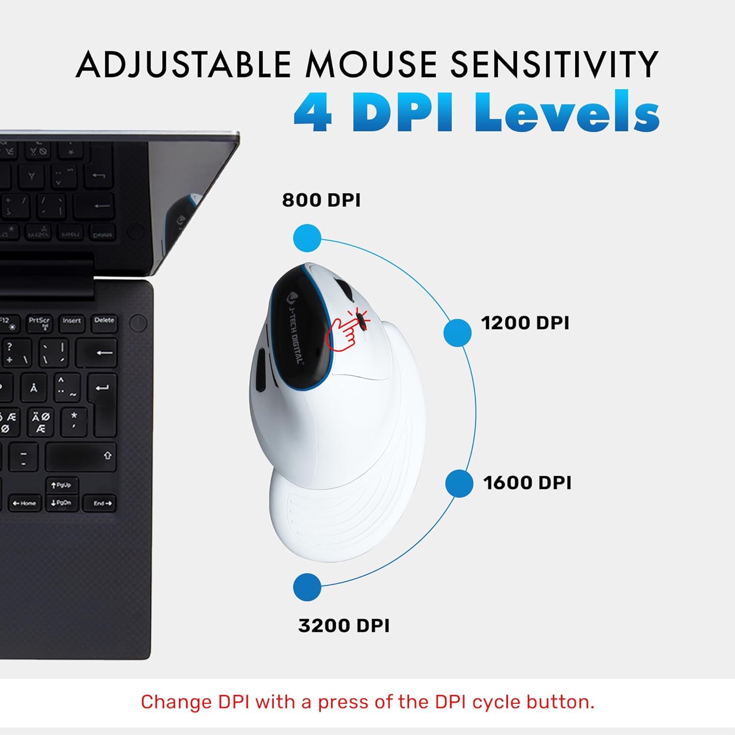 J-Tech Digital Wireless Mouse, Vertical Ergonomic Mouse with Bluetooth Dual Modes + USB Dongle + Rechargeable w/ 2.4GHz Wireless + Adjustable DPI 3200 for Laptop, Desktop, PC, Mac [V638W], White